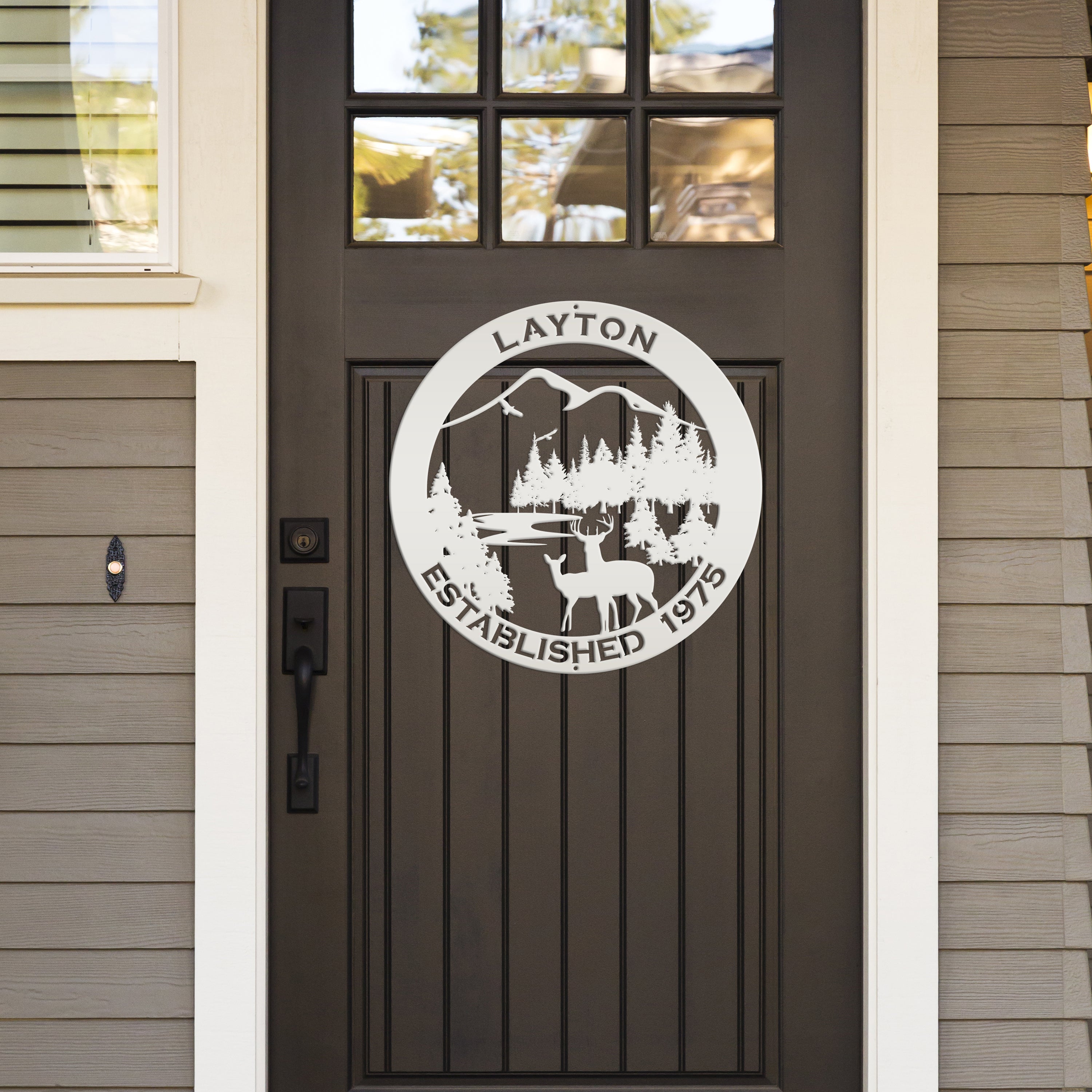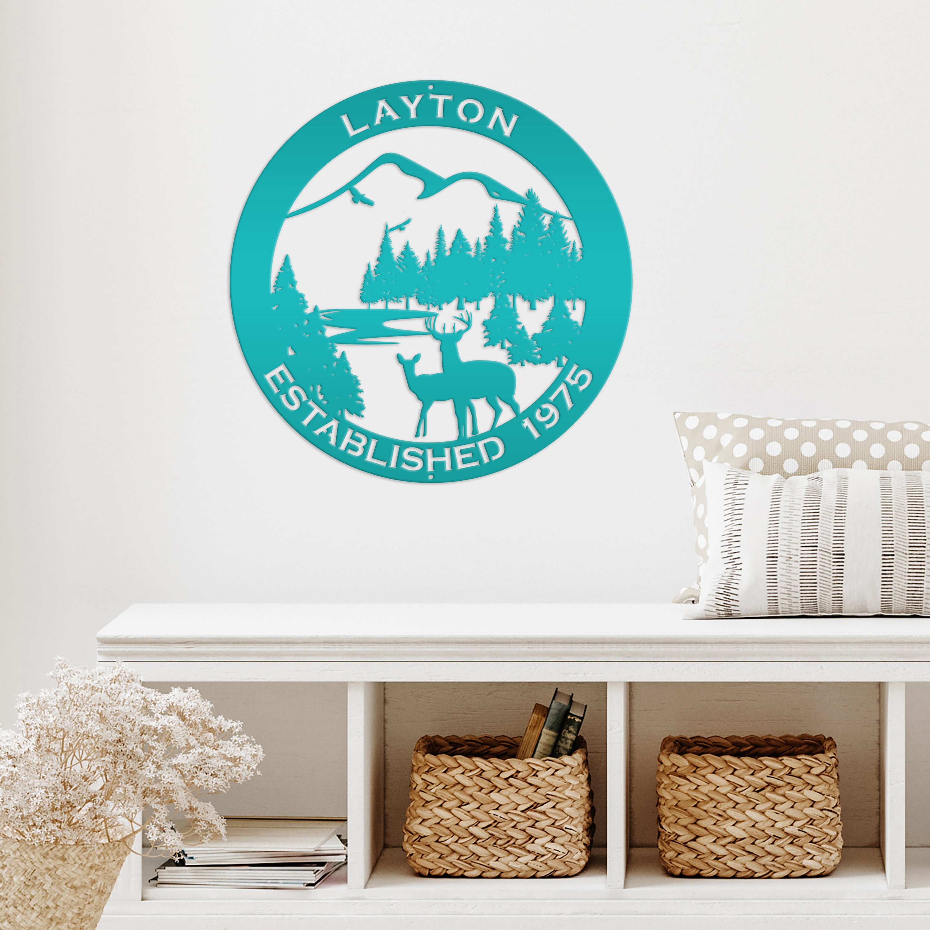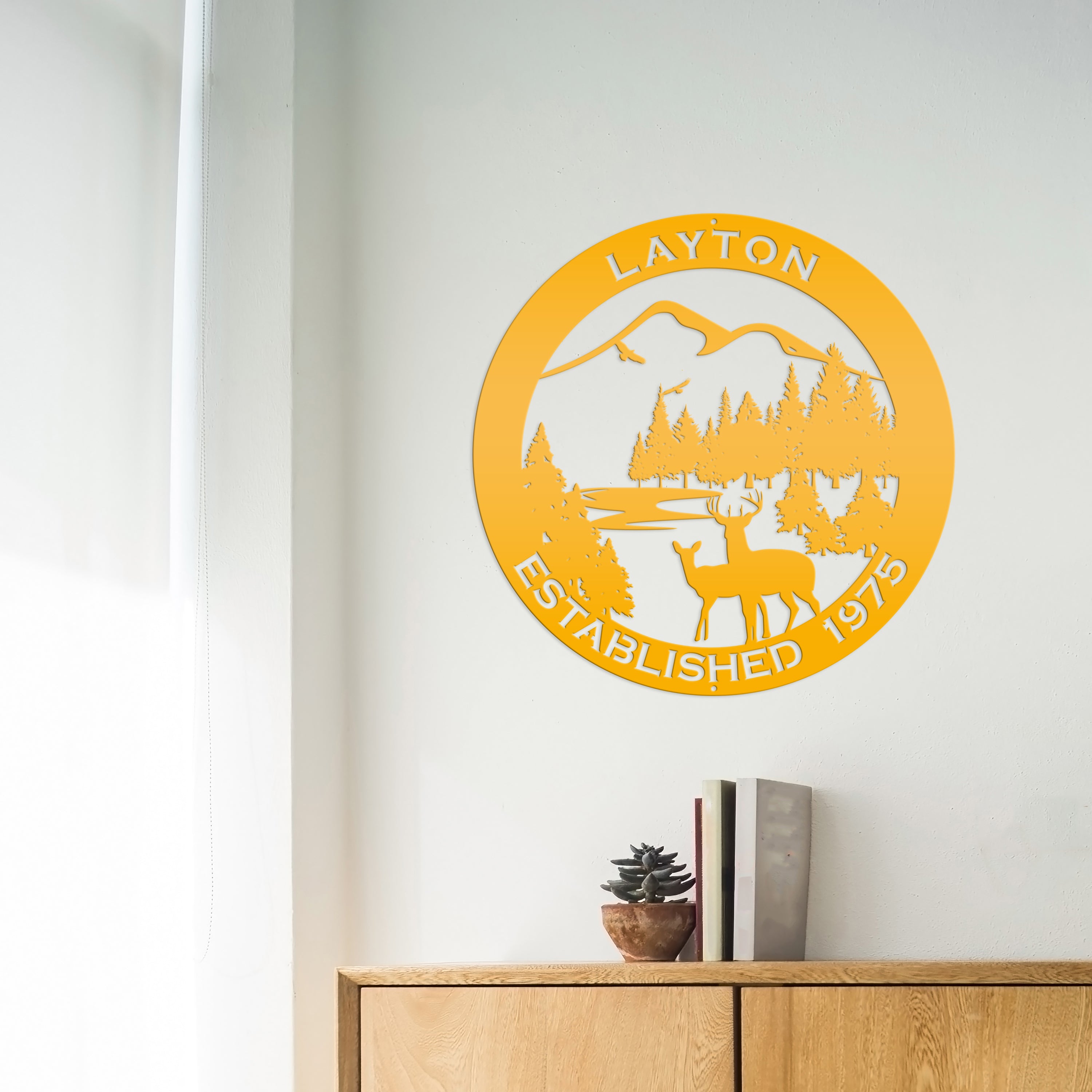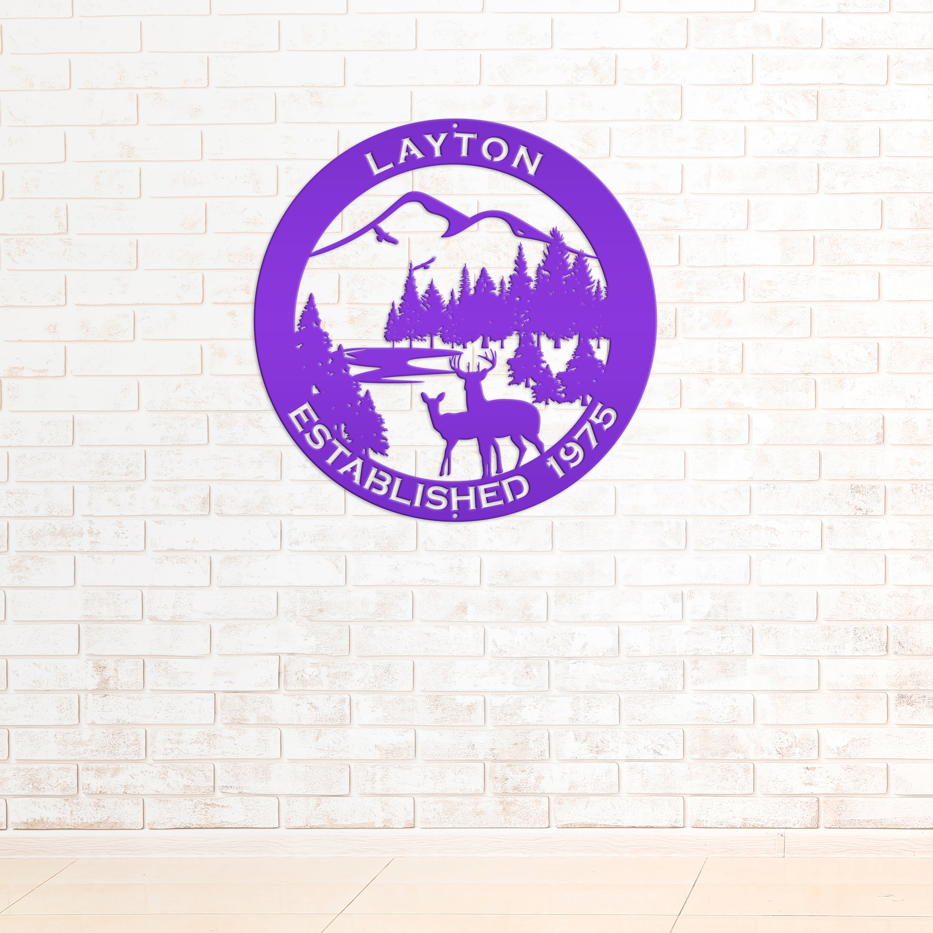 This Personalized Family Name Outdoor Mountain Deer Scene with Established Date Round Metal Sign is the perfect decor for any home. Also makes a great gift for the hunter in your life.