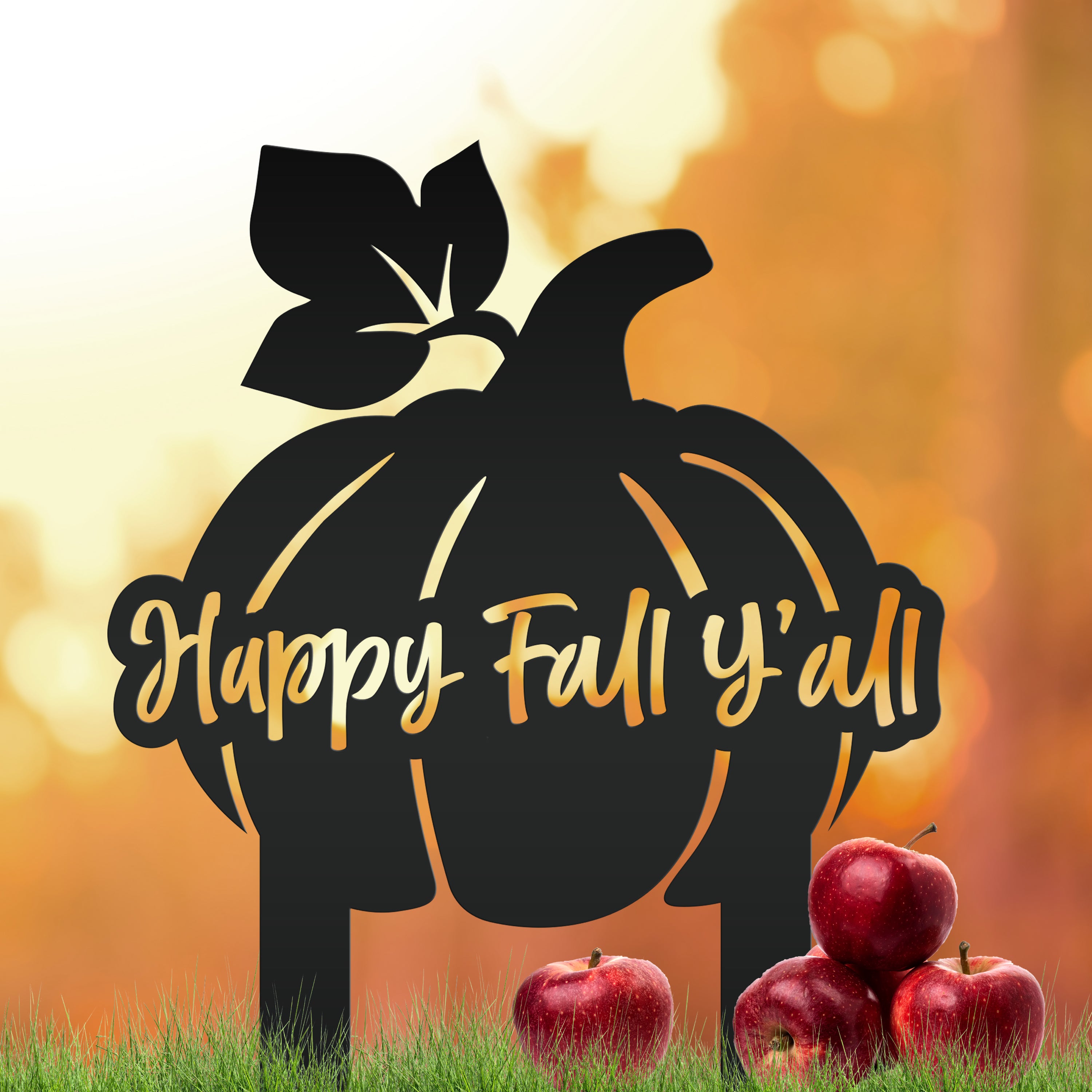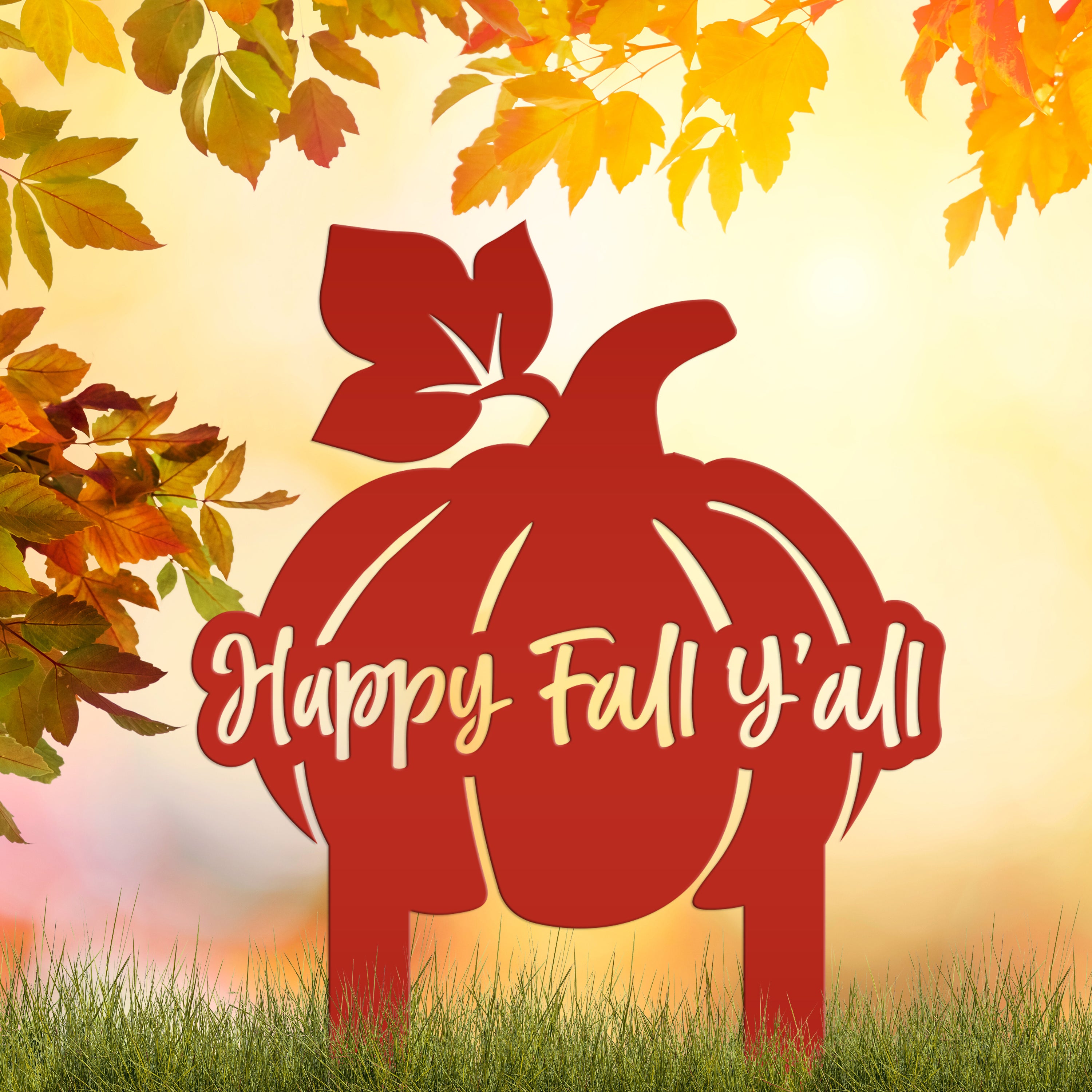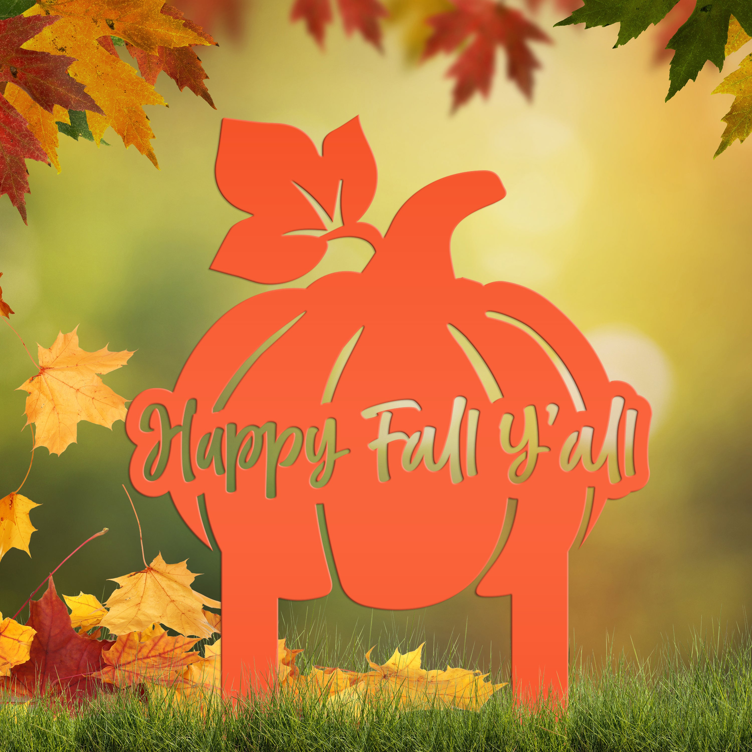 Welcome the Fall season with the Happy Fall Y'all Pumpkin outdoor yard decor and metal yard stake. This cute pumpkin cutout brings a hint of warmth and charm to any outdoor area for a festive look. Crafted from durable weather-resistant materials, the piece is designed to remain bright and inviting for years to come. Let it be the perfect addition to your Fall decor collection.