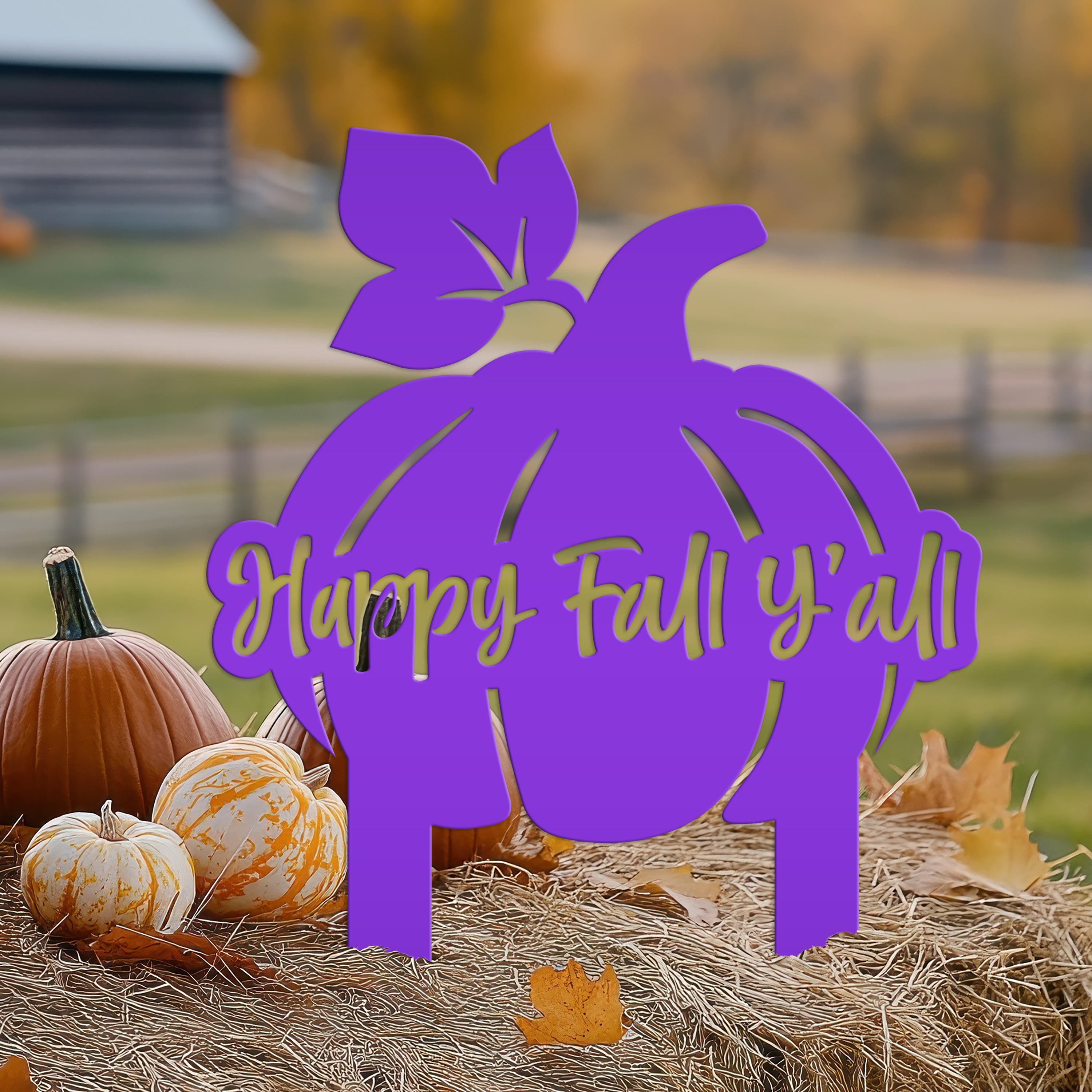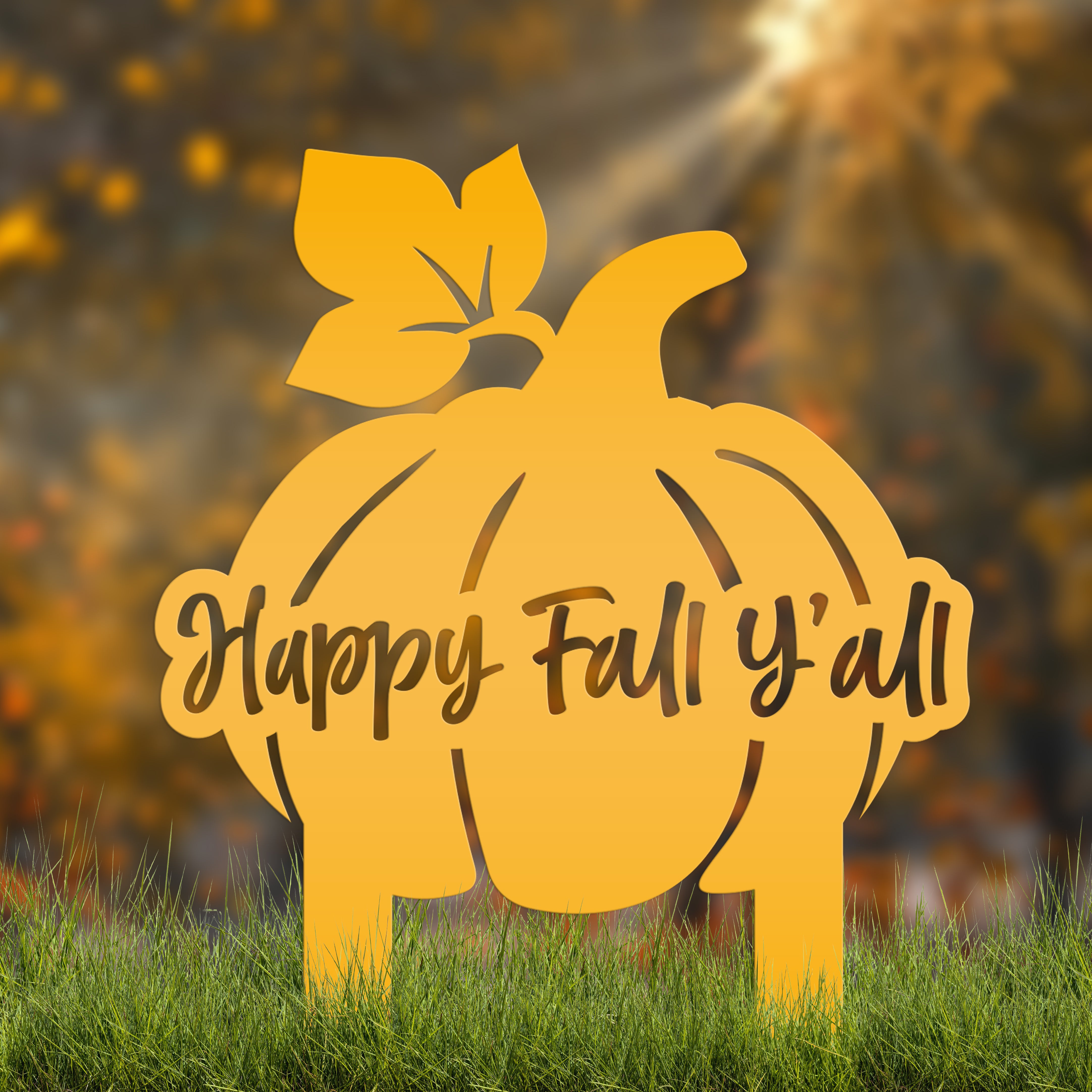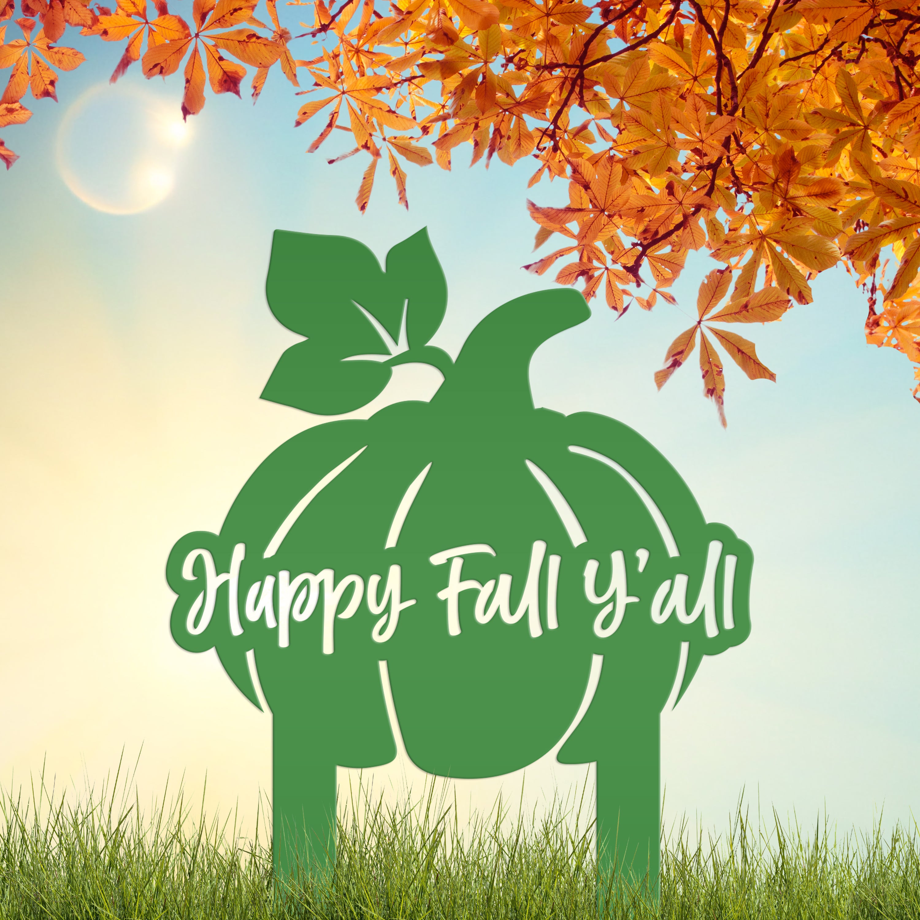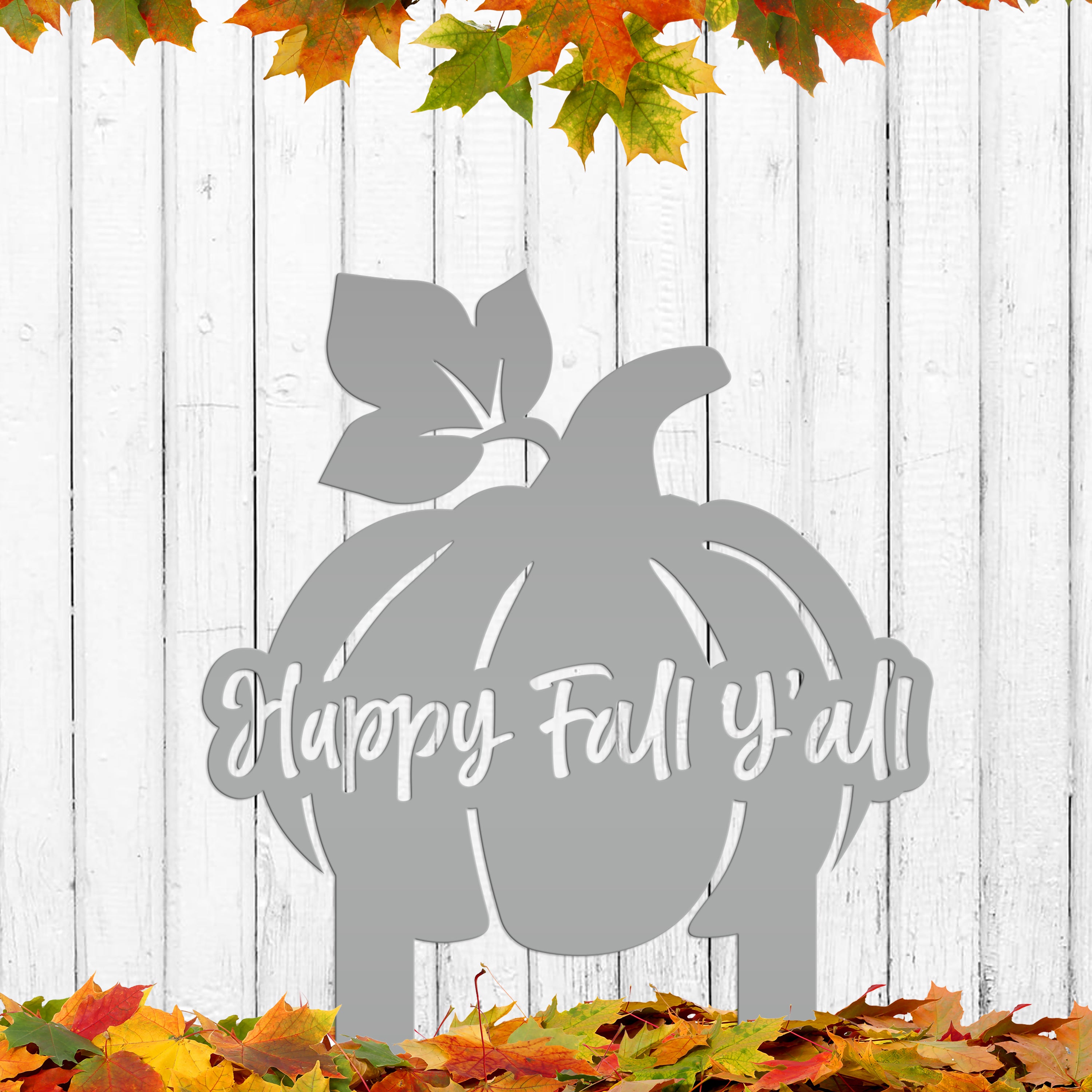 Welcome the Fall season with the Happy Fall Y'all Pumpkin outdoor yard decor and metal yard stake. This cute pumpkin cutout brings a hint of warmth and charm to any outdoor area for a festive look. Crafted from durable weather-resistant materials, the piece is designed to remain bright and inviting for years to come. Let it be the perfect addition to your Fall decor collection.