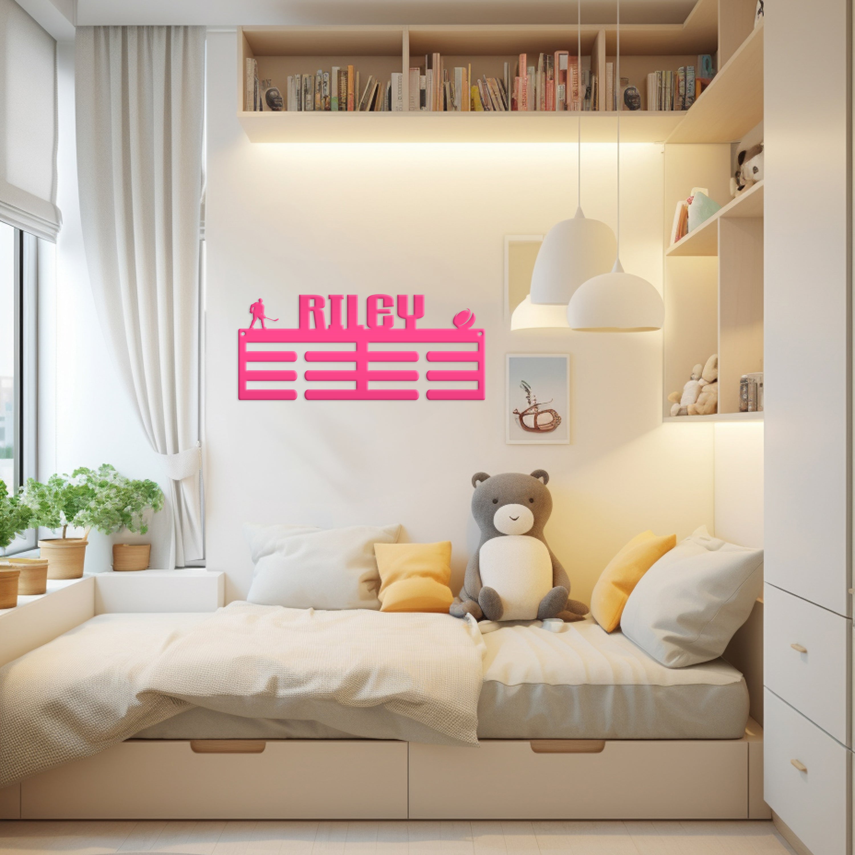 Display your hard-earned hockey medals with pride on our Medal Hanger! This personalized metal awards rack features a custom name sign, adding a unique touch. Whether it's for a boy or girls' bedroom, this sports wall hanger is the perfect gift idea for any hockey enthusiast. Don't hide your achievements, showcase them in style!