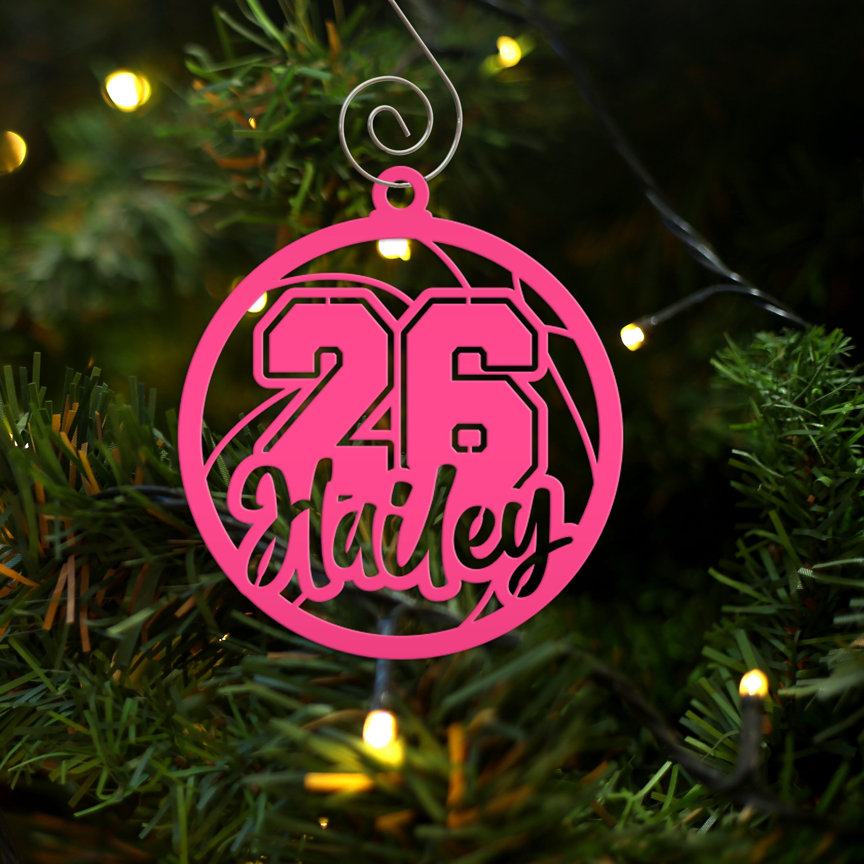This Personalized Basketball Name and Number Metal Christmas Ornament is the perfect way to deck your halls for the holidays. Makes a great gift or stocking stuffer. Made from steel and a powder coated finish or left in a bare metal finish that will rust when exposed to humidity. This ornament measures 4" tall and does NOT include a ribbon or cord for hanging.