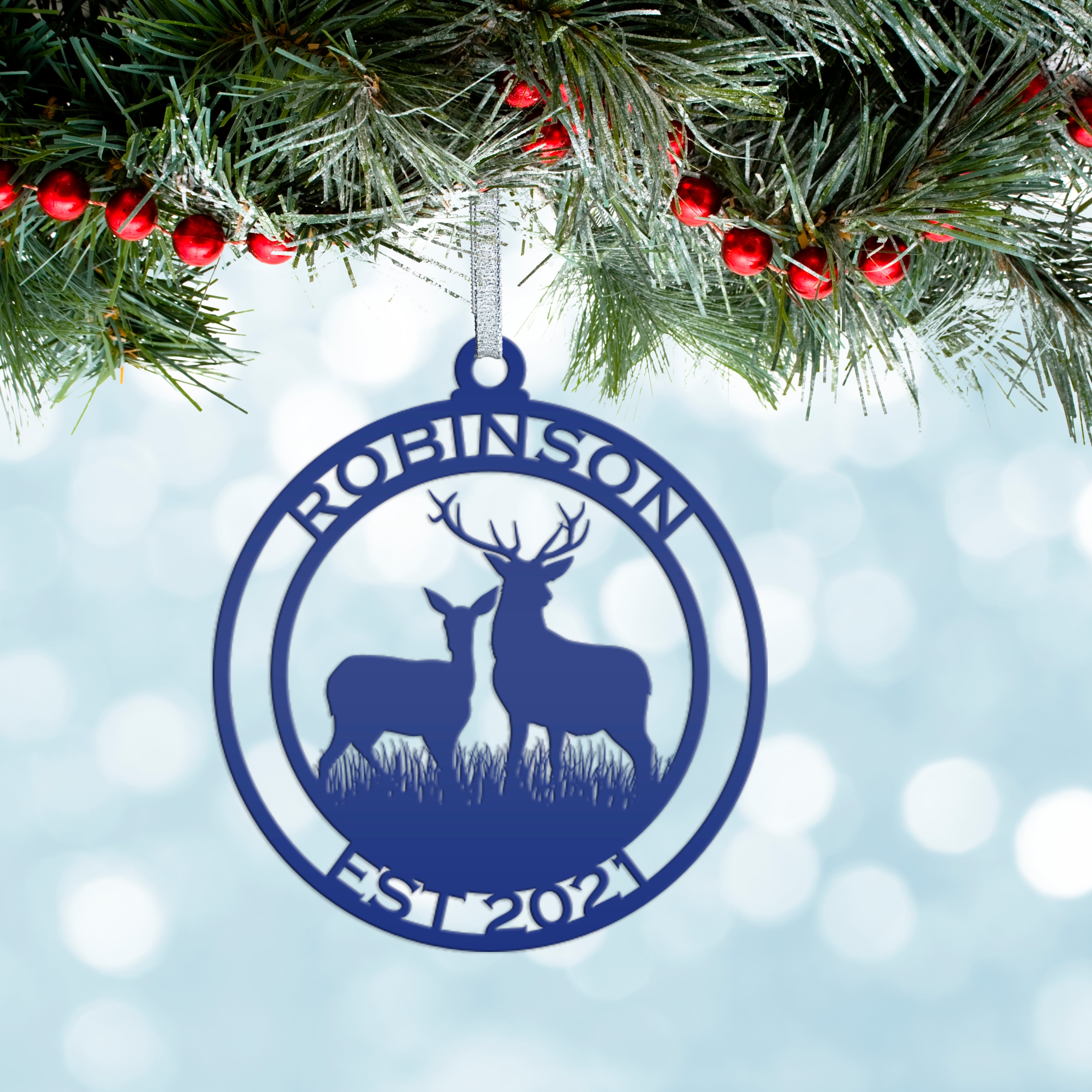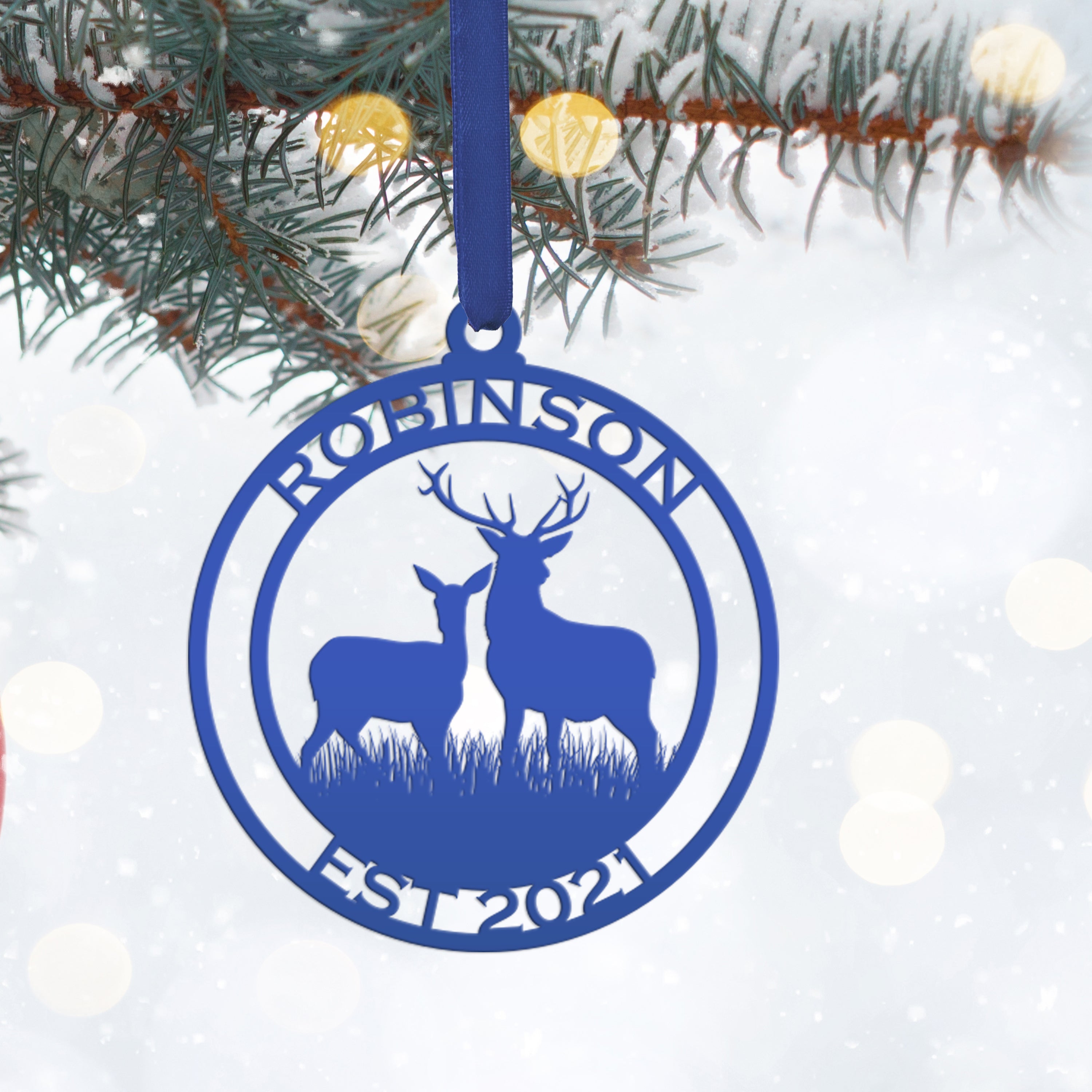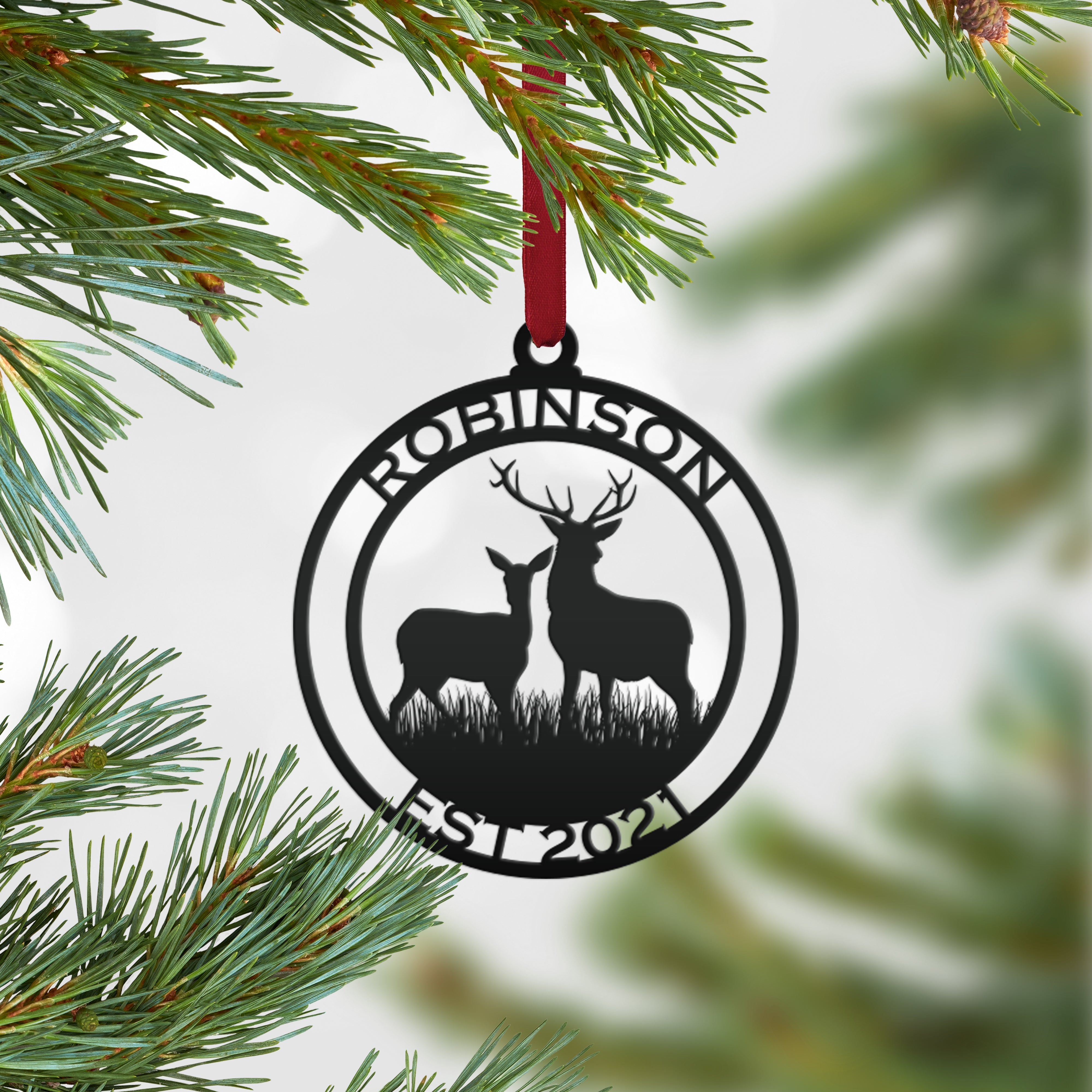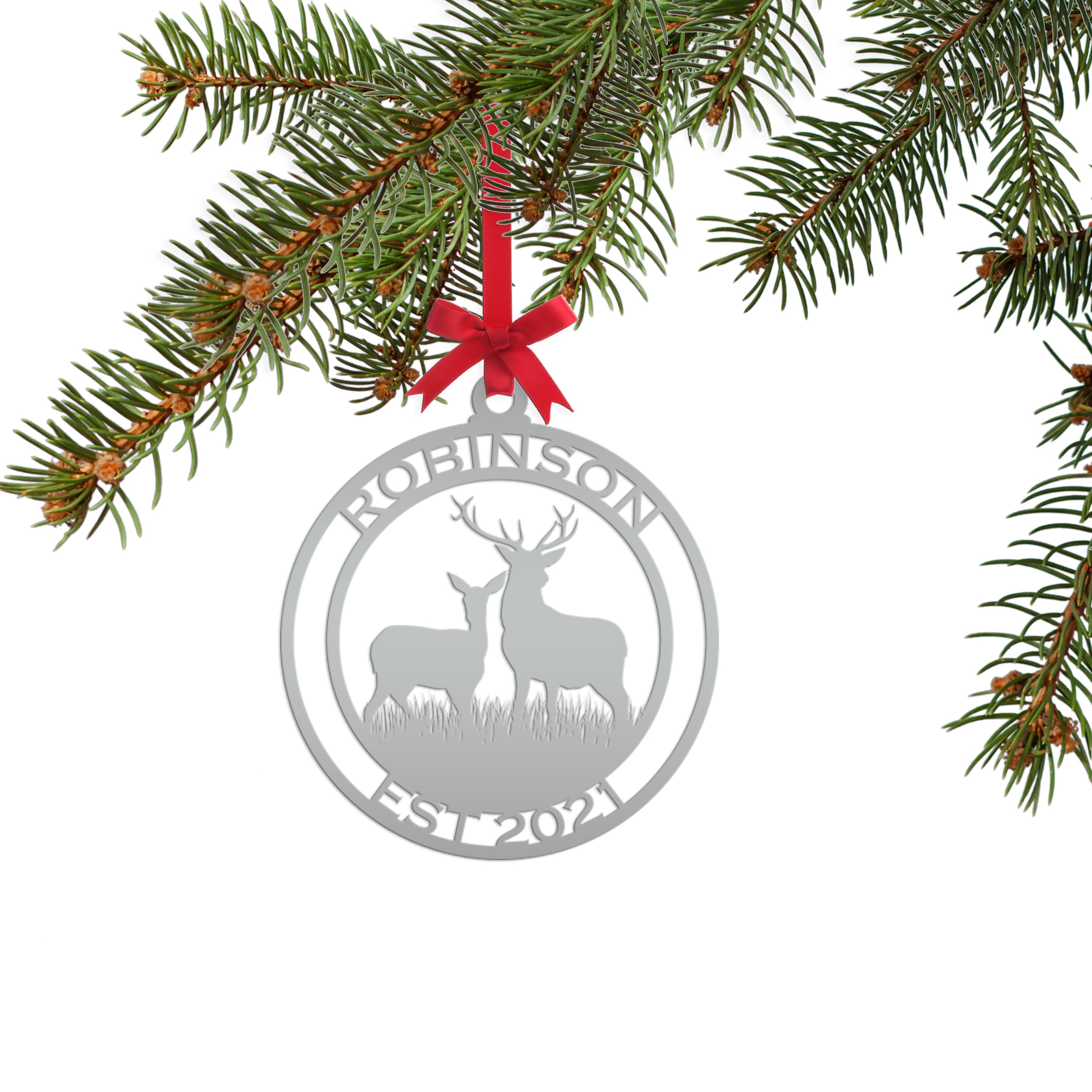 This Personalized Name and Established Date Deer Metal Christmas Ornament is the perfect way to deck your halls for the holidays. Makes a great gift or stocking stuffer. Made from 16-gauge steel with a powder coated finish. This ornament measures 4" tall and does NOT include a ribbon or cord for hanging.