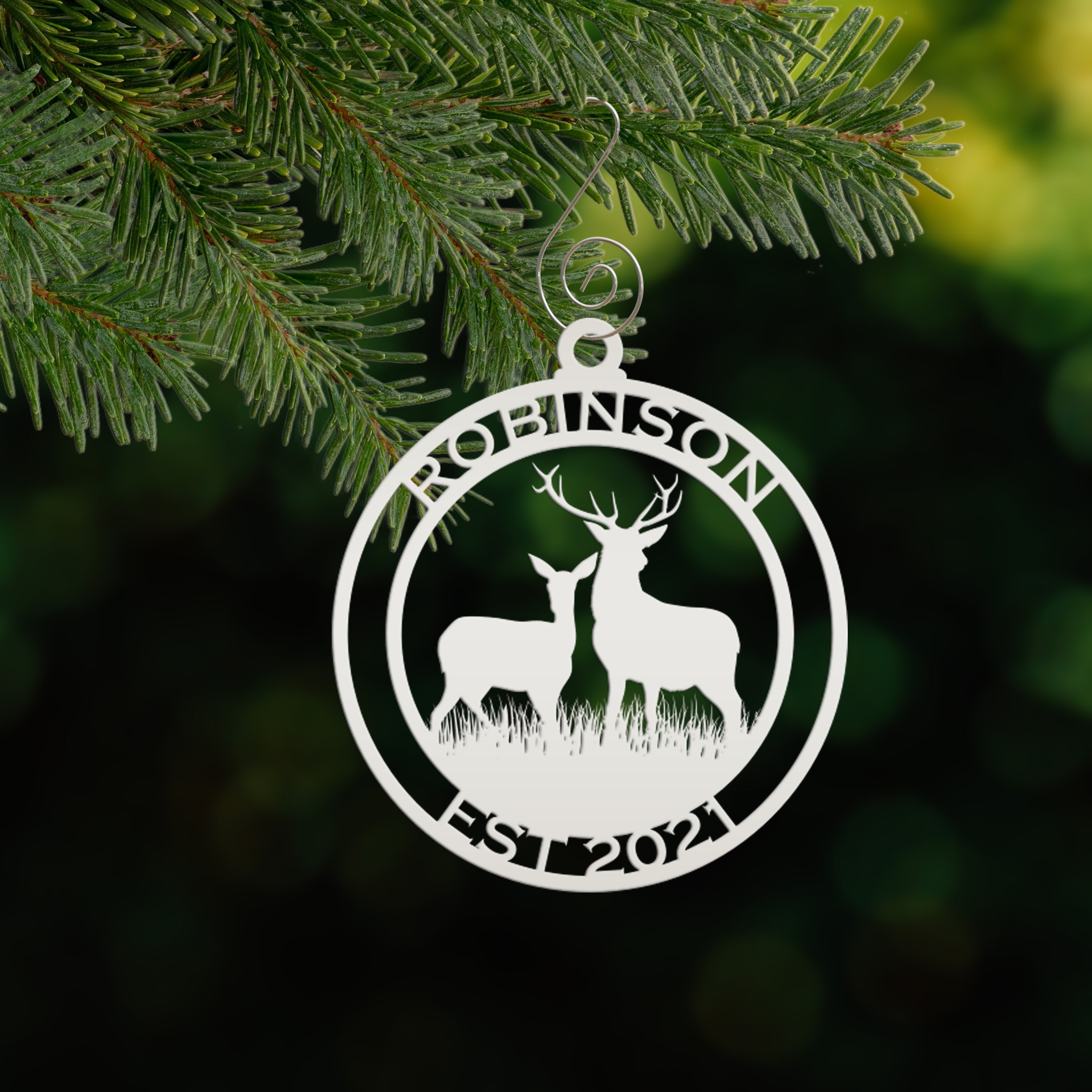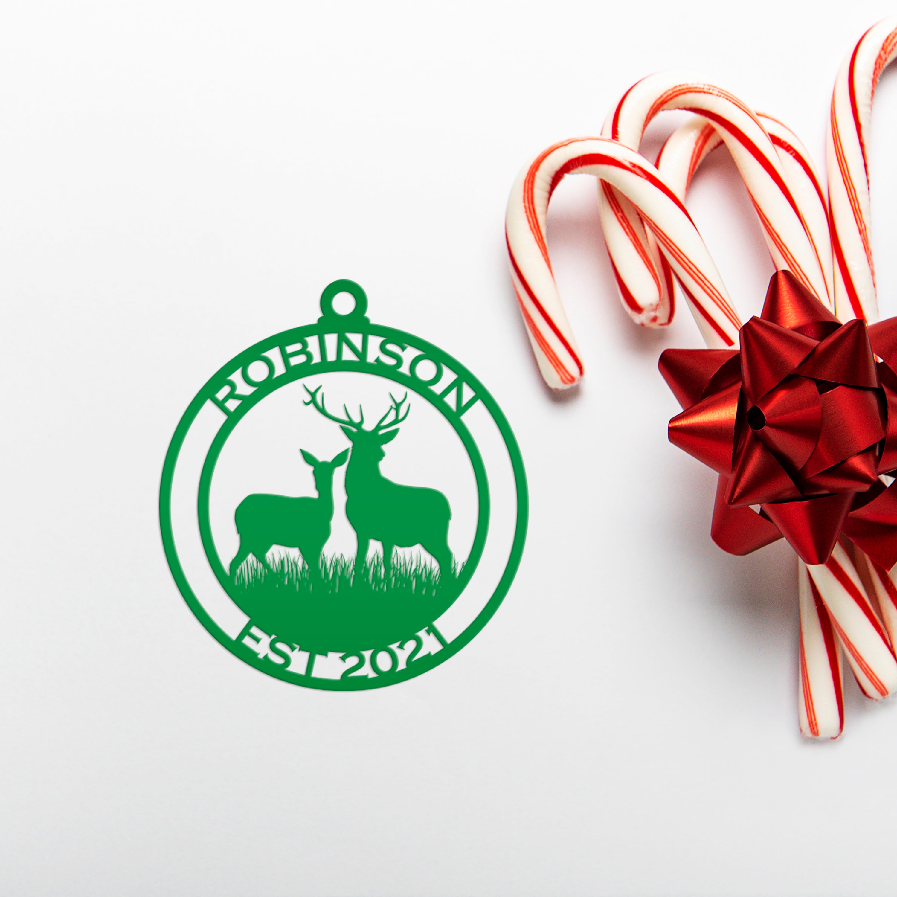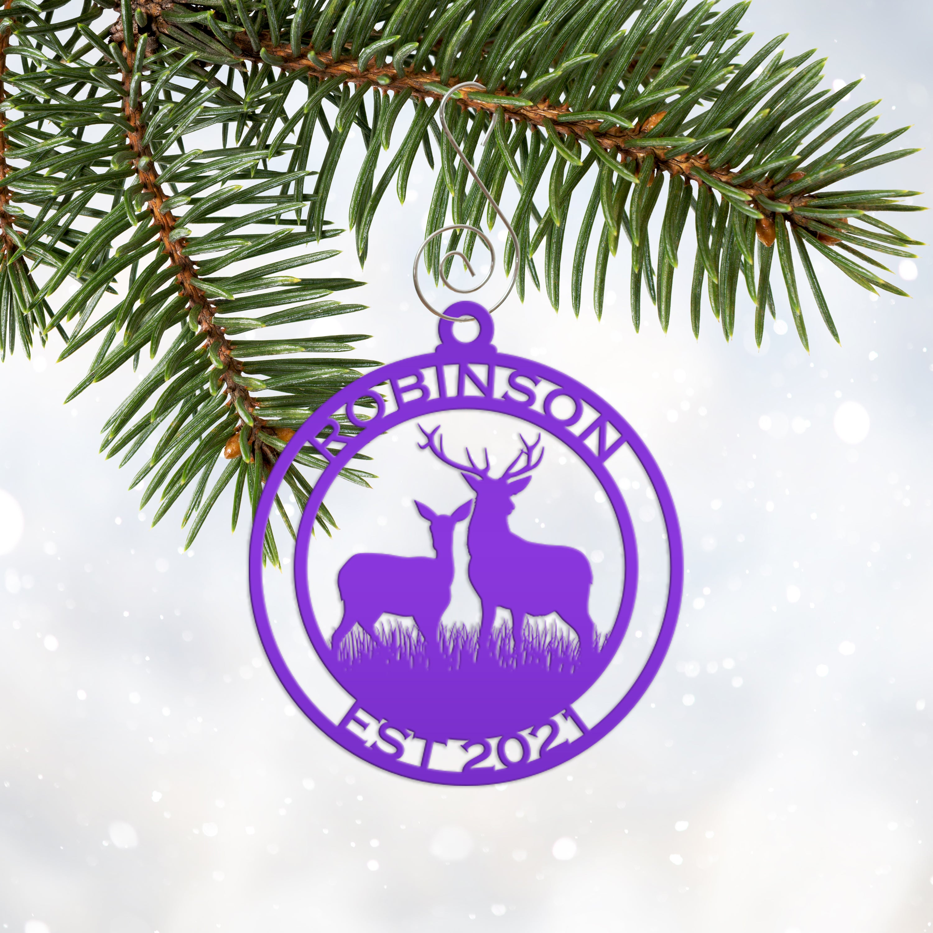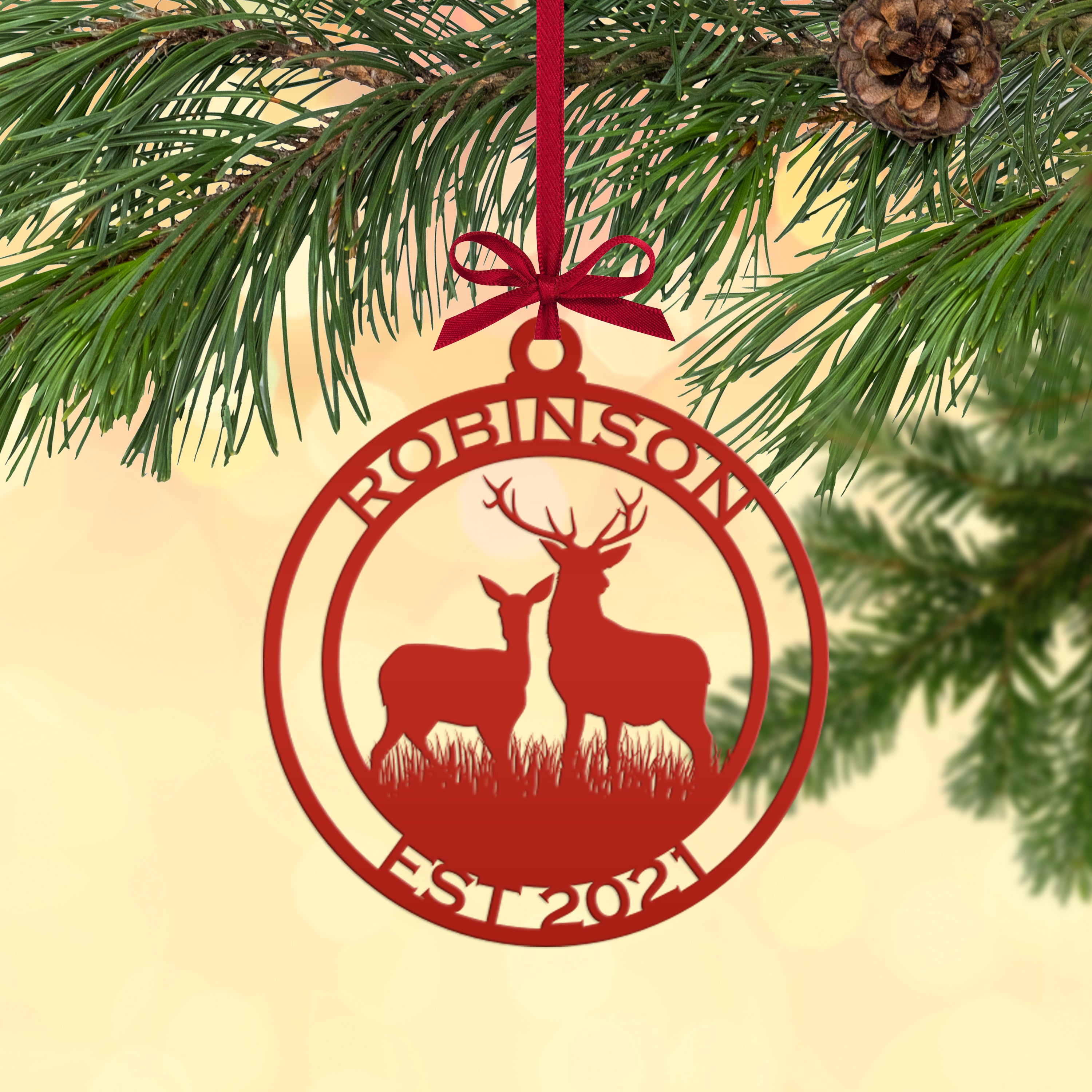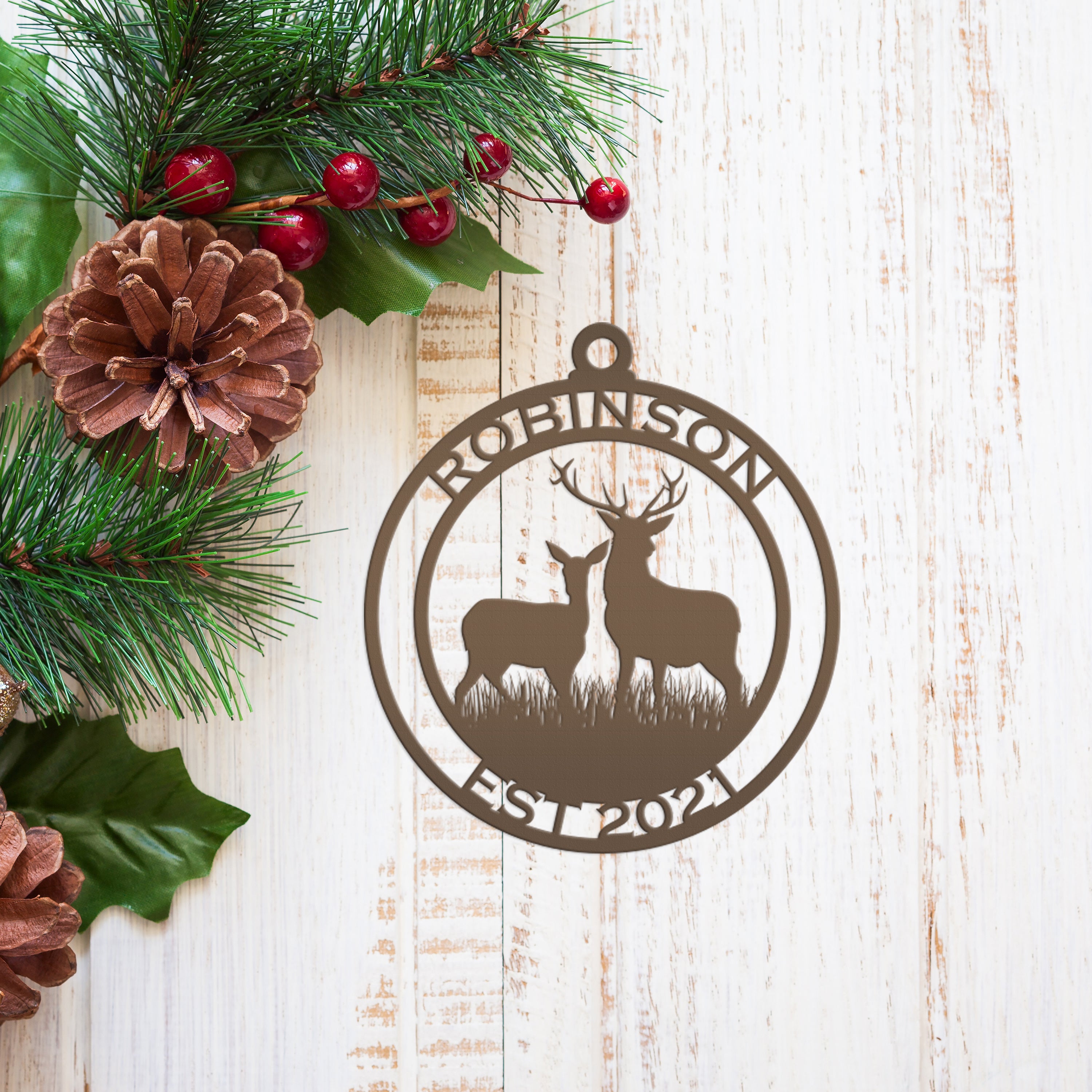 This Personalized Name and Established Date Deer Metal Christmas Ornament is the perfect way to deck your halls for the holidays. Makes a great gift or stocking stuffer. Made from 16-gauge steel with a powder coated finish. This ornament measures 4" tall and does NOT include a ribbon or cord for hanging.