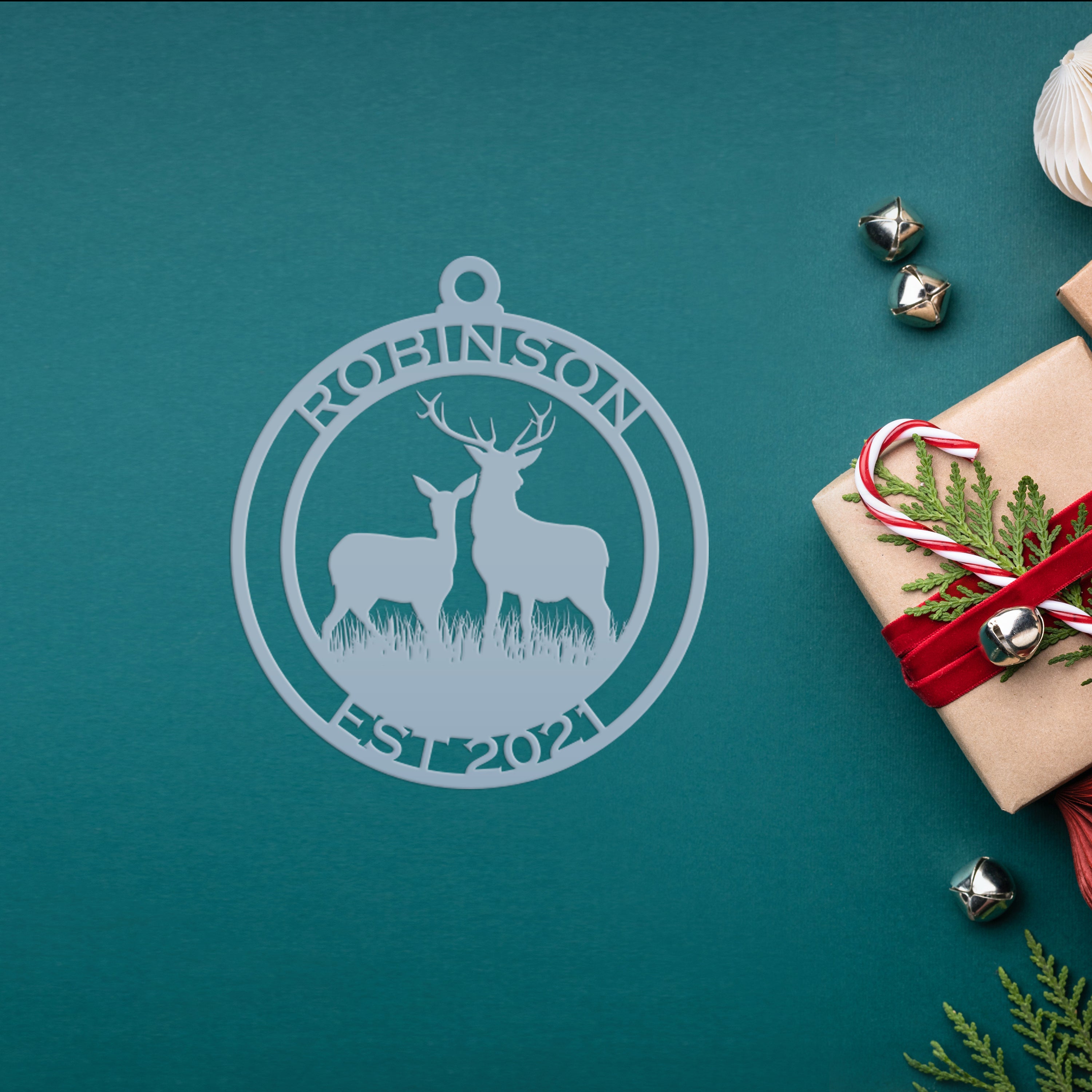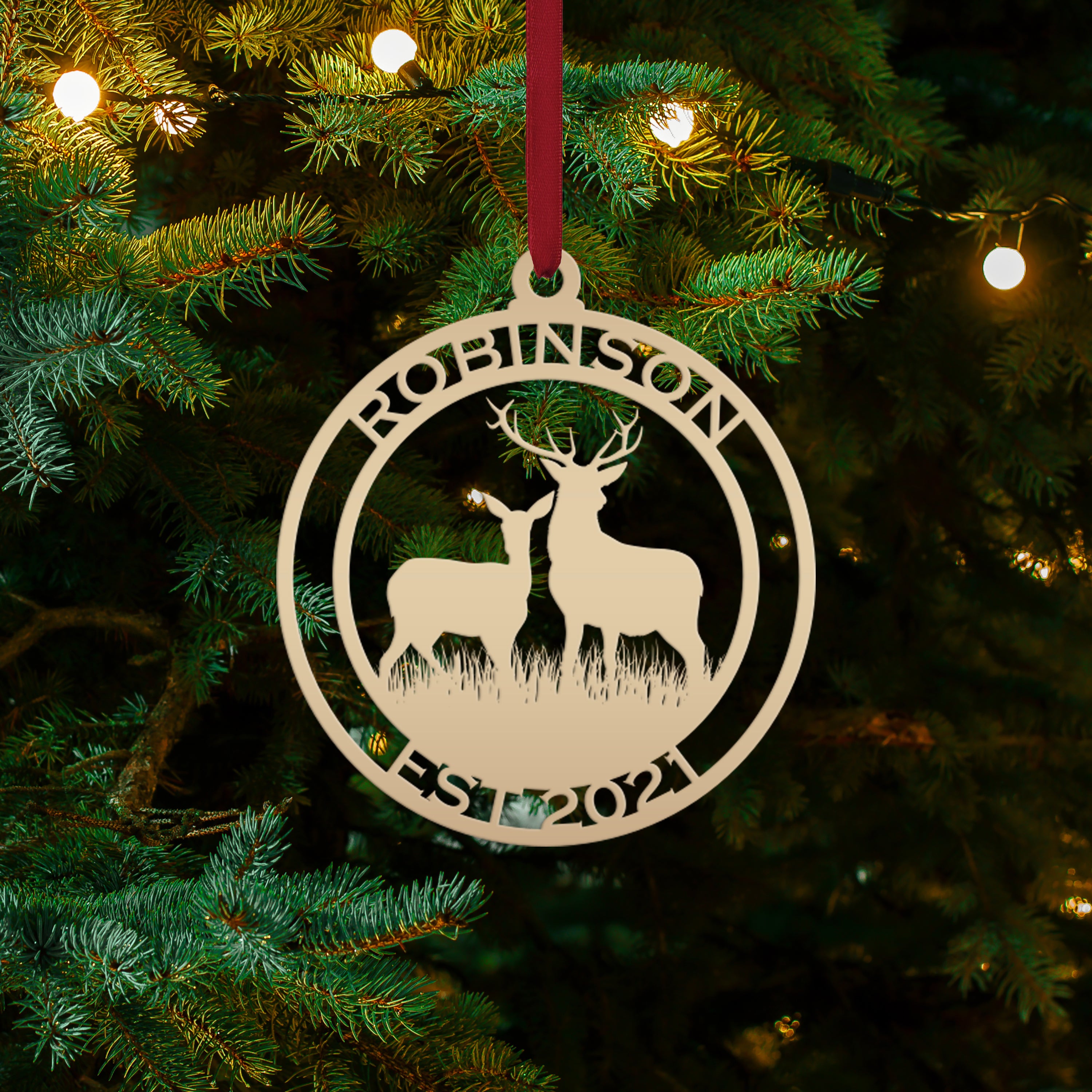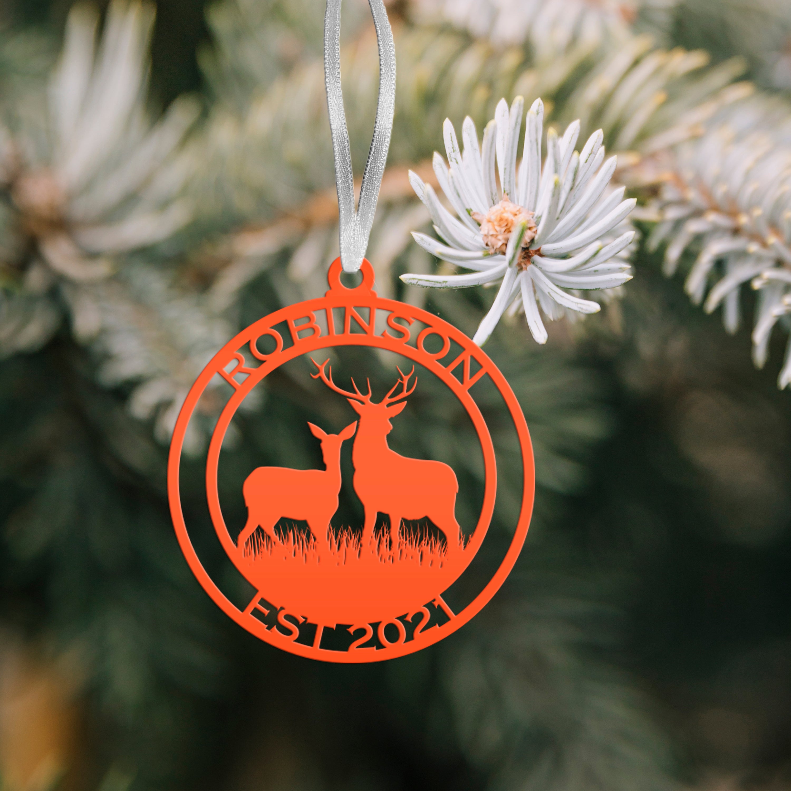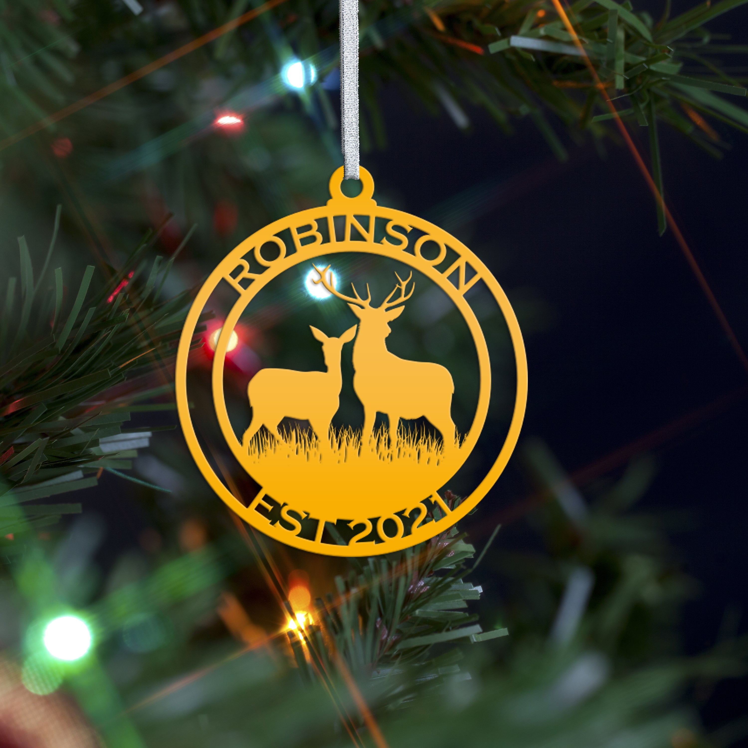 This Personalized Name and Established Date Deer Metal Christmas Ornament is the perfect way to deck your halls for the holidays. Makes a great gift or stocking stuffer. Made from 16-gauge steel with a powder coated finish. This ornament measures 4" tall and does NOT include a ribbon or cord for hanging.