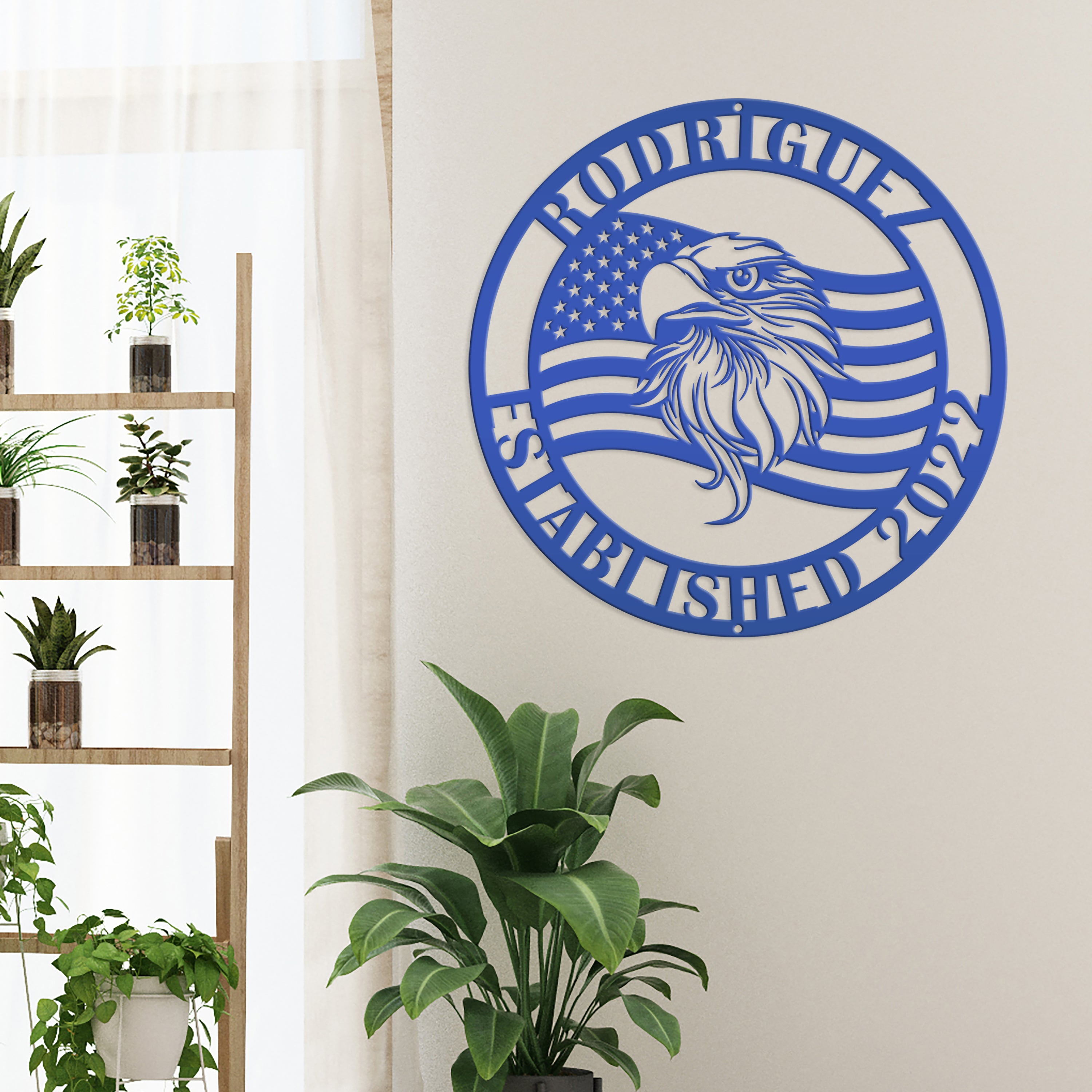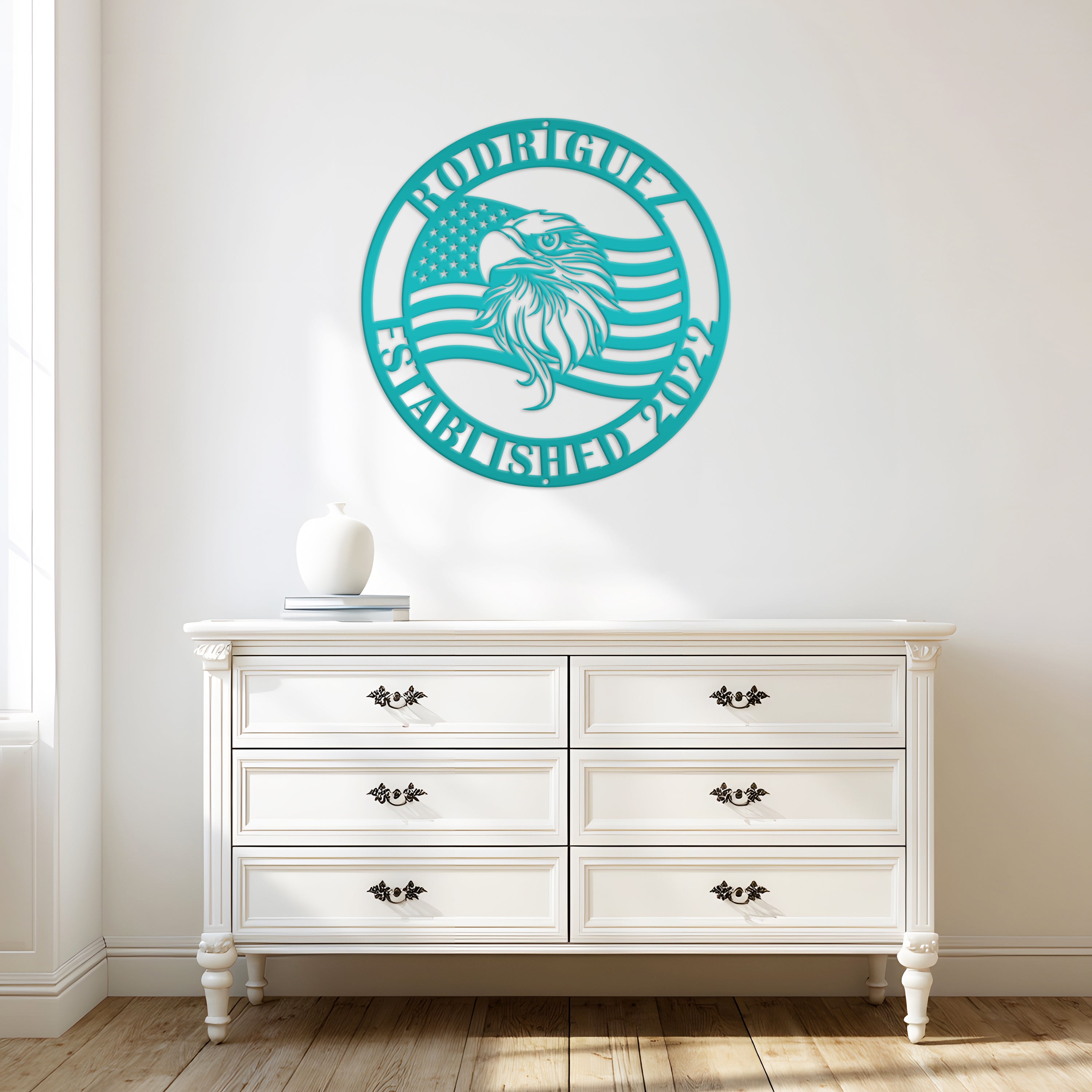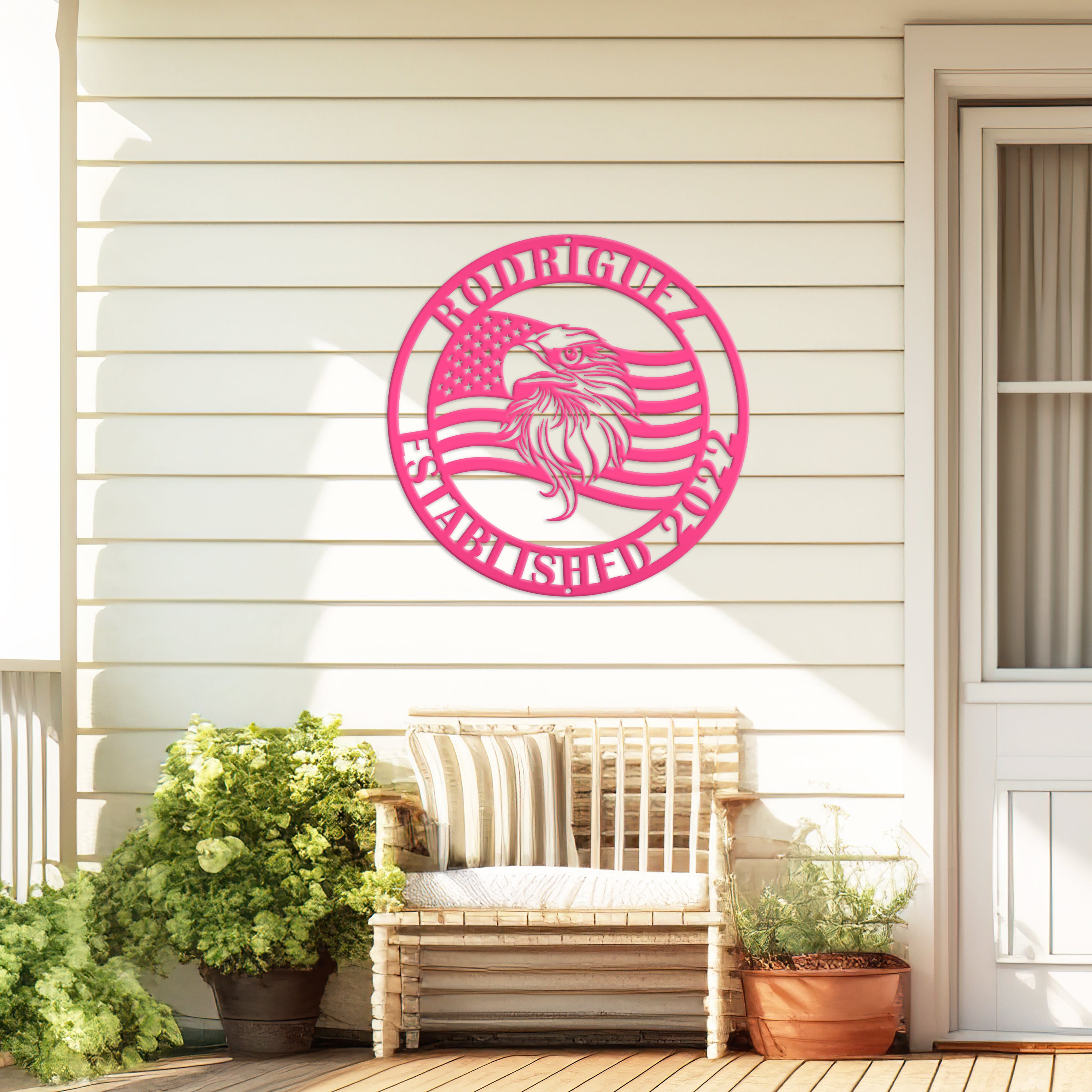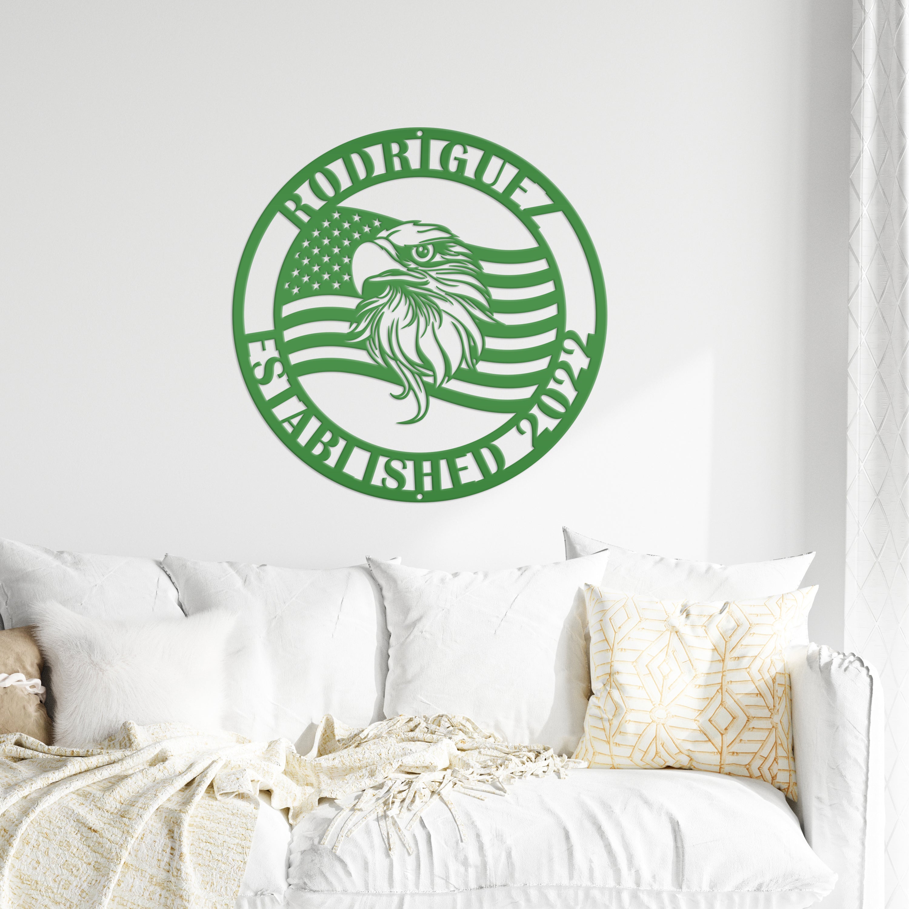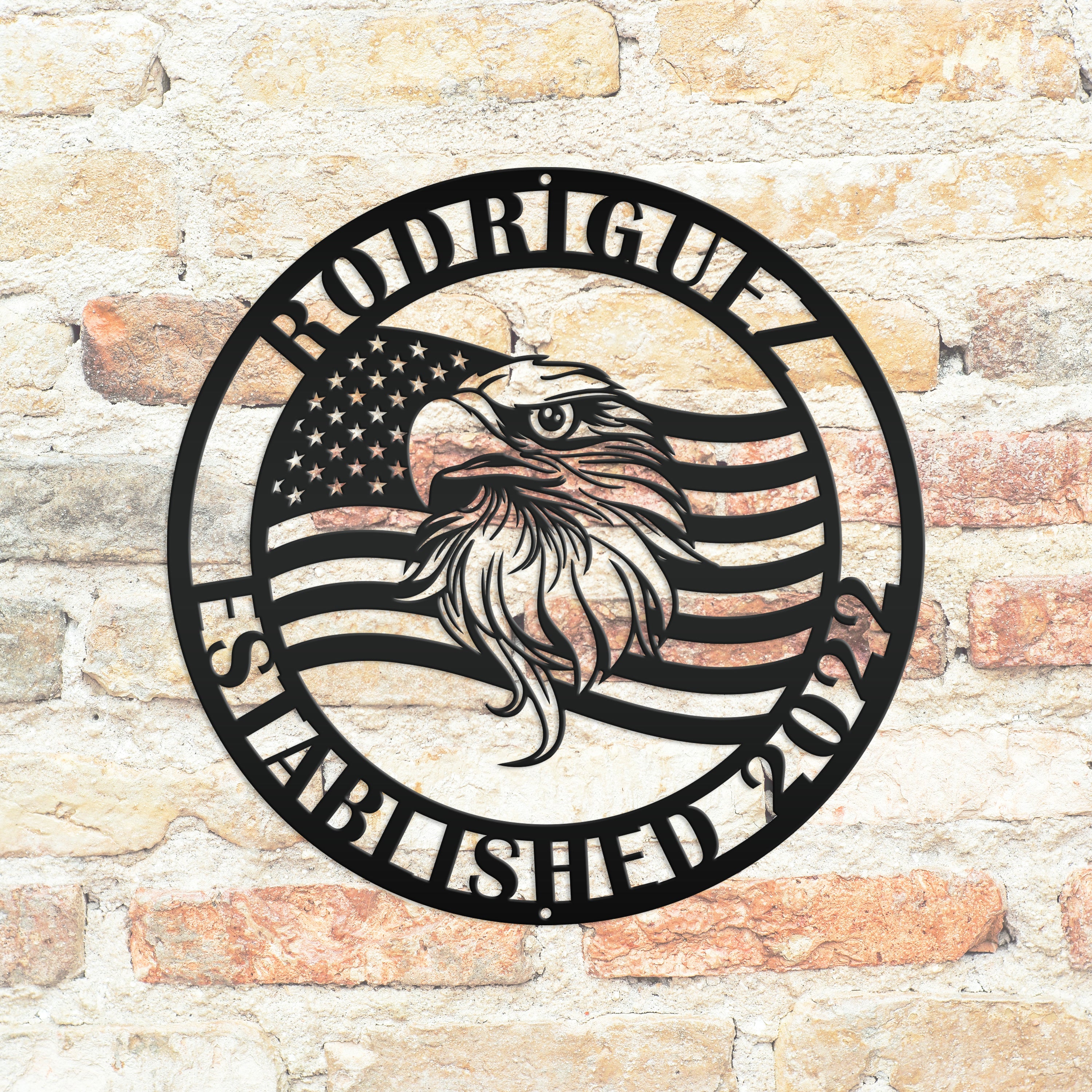Make a statement of patriotism with our Custom Metal Eagle and Flag Sign. This unique door hanger features a majestic eagle soaring above the iconic American flag, creating a powerful symbol of national pride.