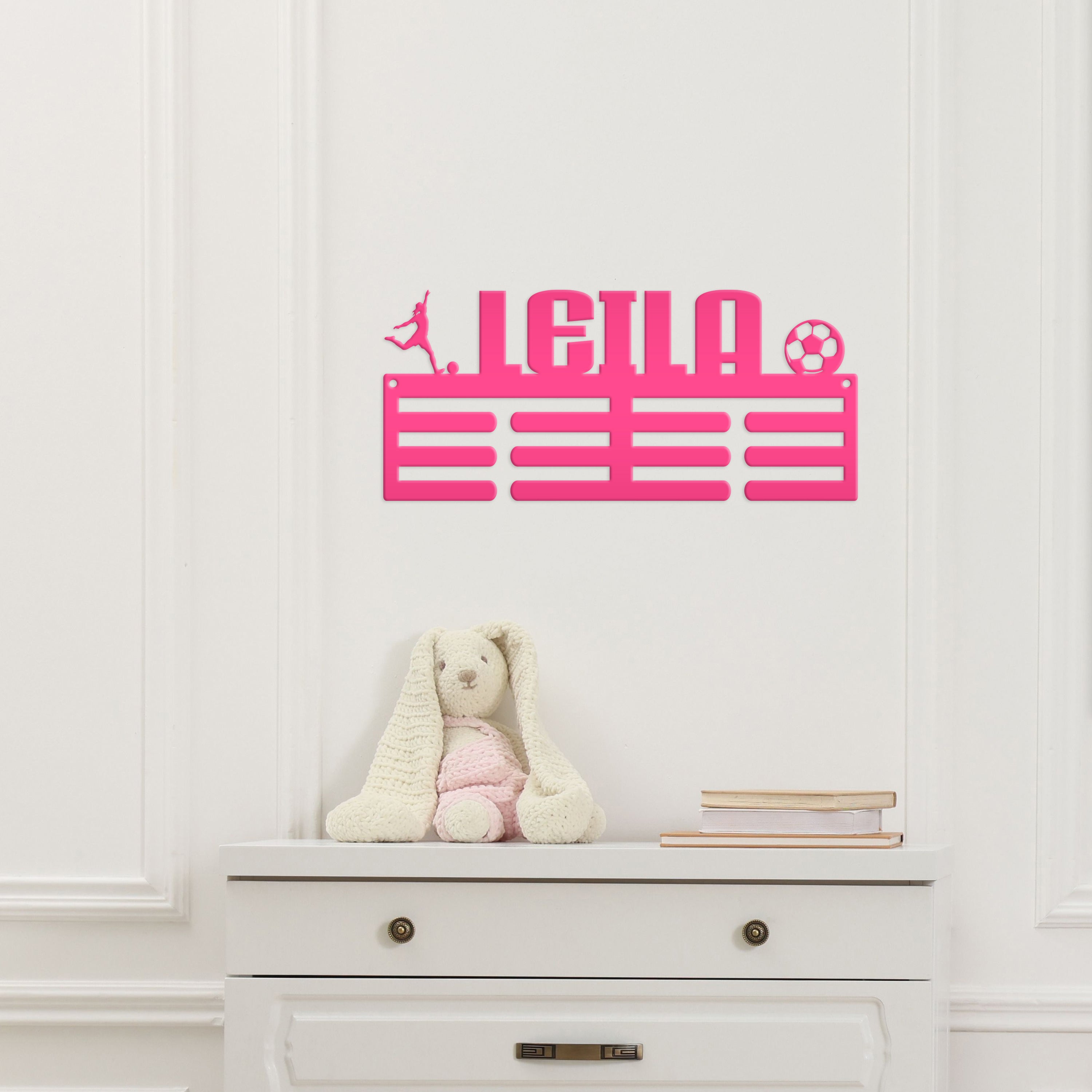 Introducing our Medal Hanger Personalized Award Wall Rack, the perfect accessory for showcasing your hard-earned soccer awards! This Metal Custom Name Hanging Display is designed to beautifully display your medals, while adding a personalized touch with a custom name. Ideal for boys and girl's sports bedroom, this rack will instantly elevate any space with its sleek design. Celebrate your achievements and keep them proudly on display with this unique sports bedroom sign.