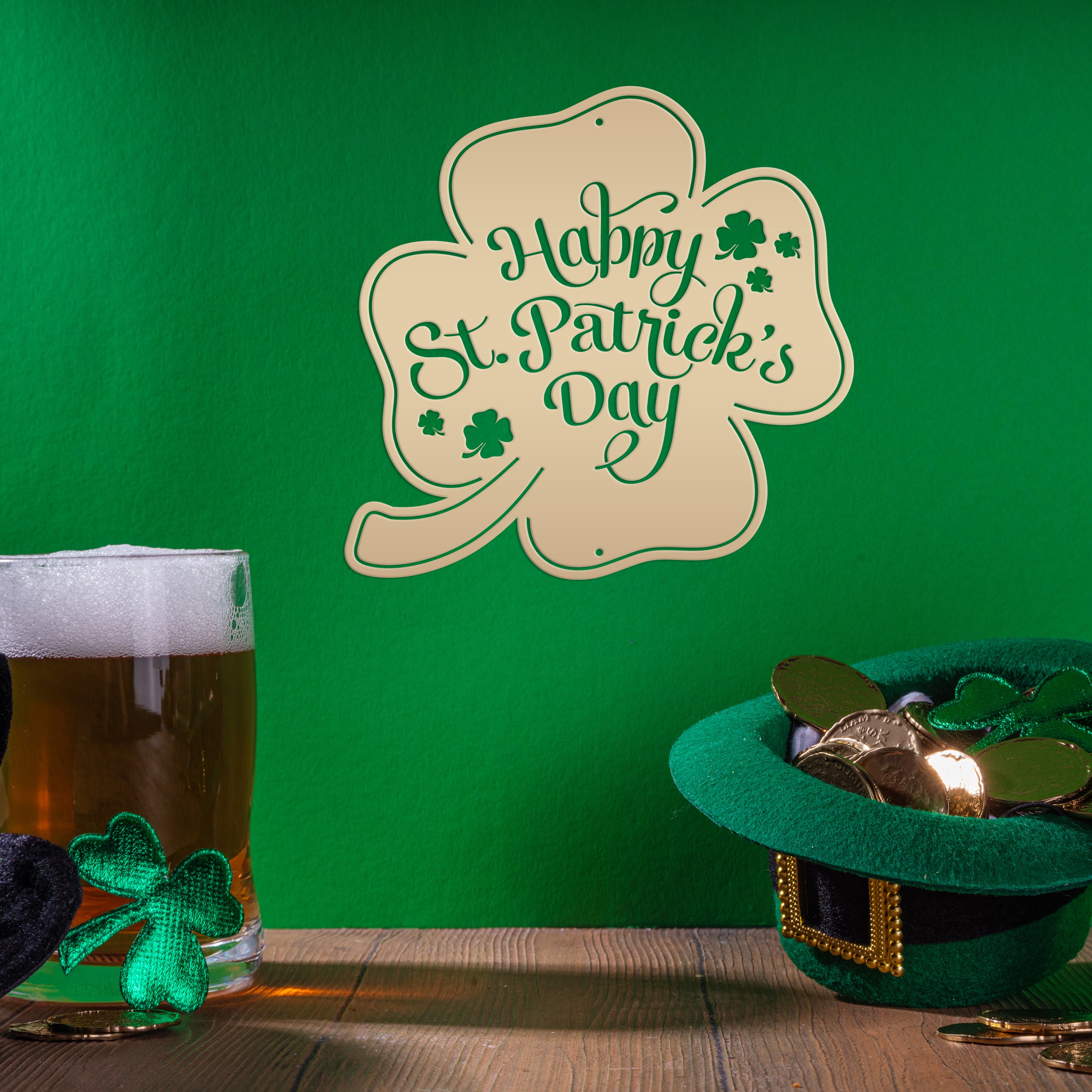Enhance your St. Patrick's Day celebration with our Happy Shamrock Metal Sign. Made for outdoor use, this festive decoration adds a touch of St. Patty's spirit. With its vibrant colors and shamrock design, it's the perfect addition to your St. Patrick's Day decor.