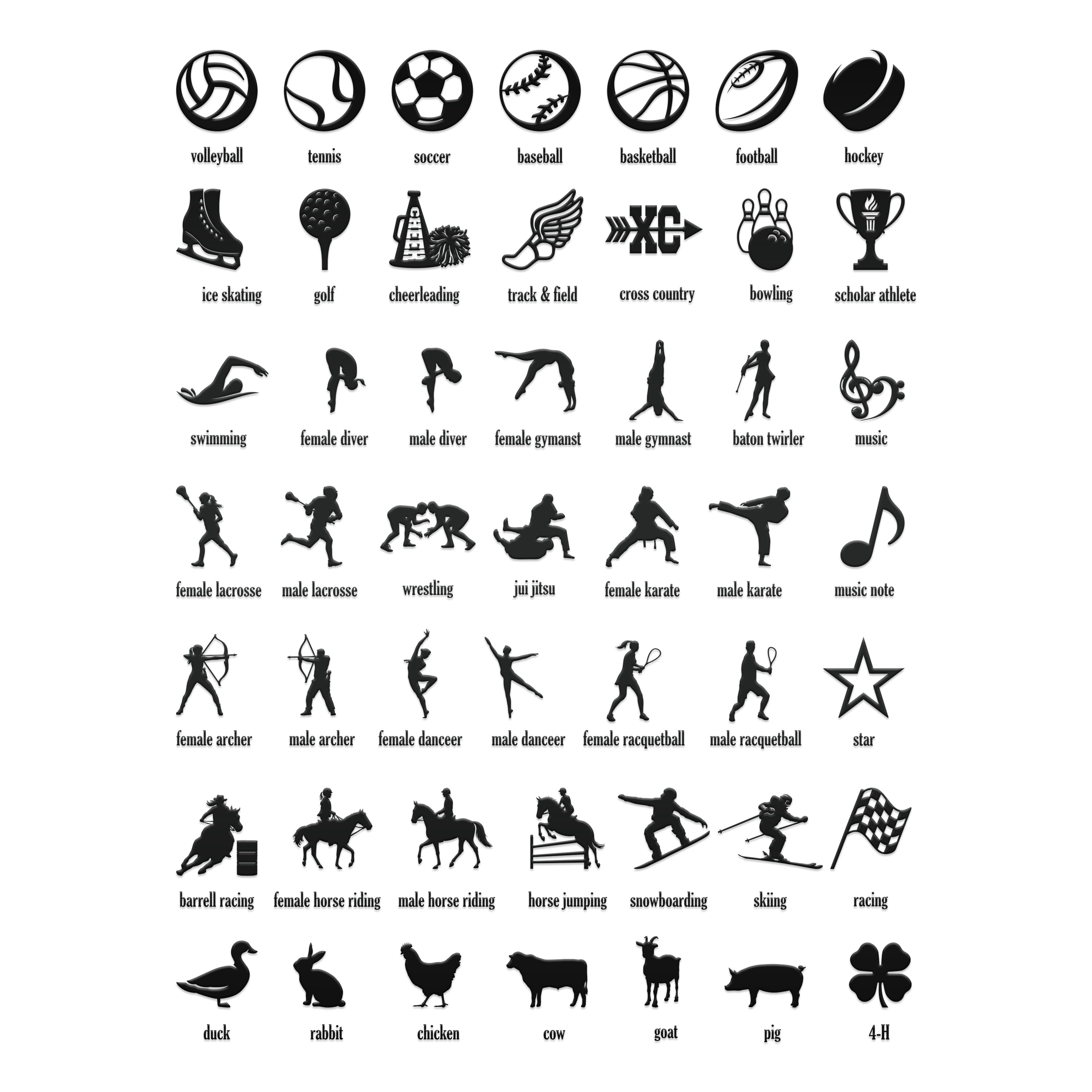 Please reference the icon picture for the sports, etc. that we offer. Put your 2 choices in the personalization box along with the name you would like on your medal holder. If only a name is left...we will leave the icons off and process the sign with the name only. If only 1 icon is listed, we will place the 1 icon on both sides of the sign.