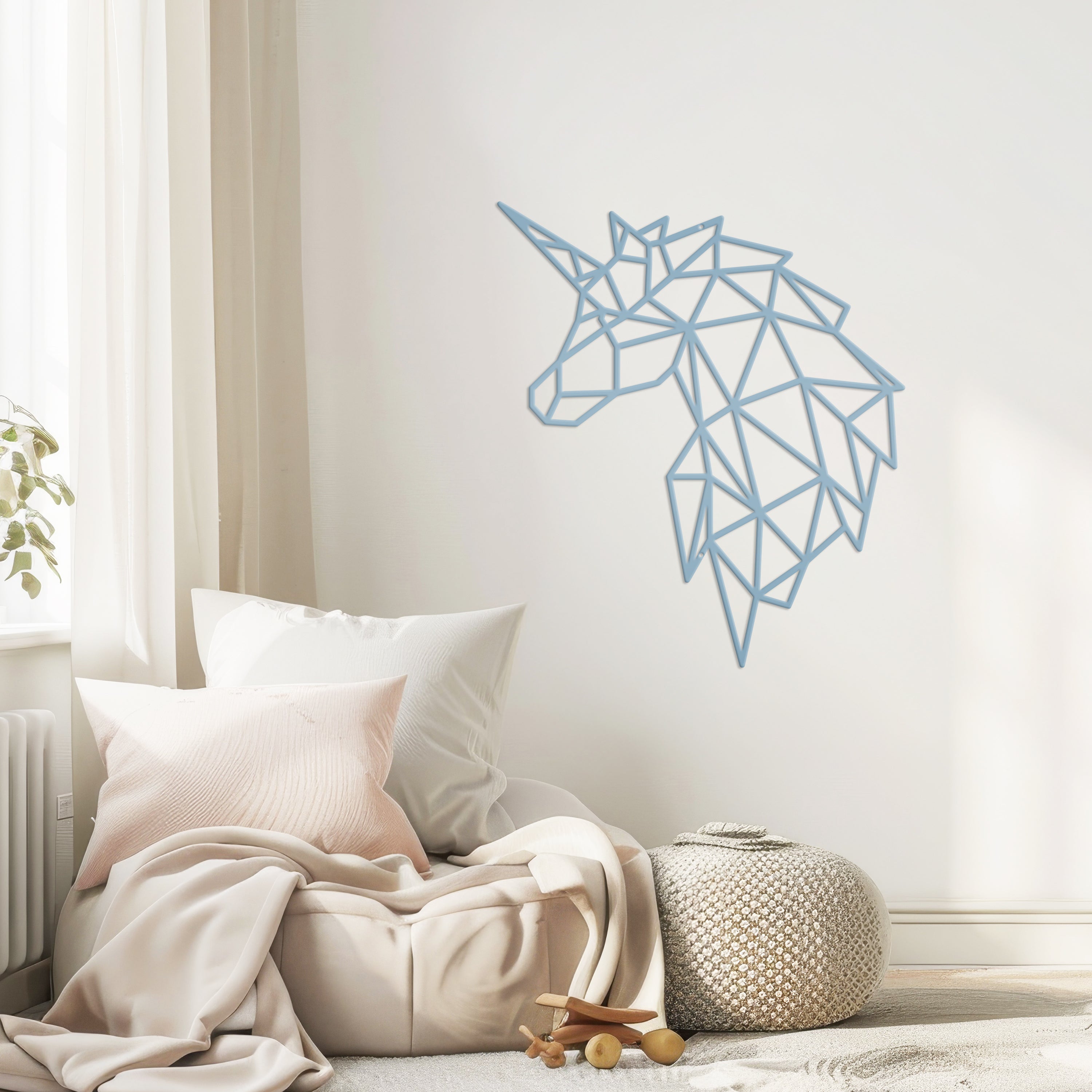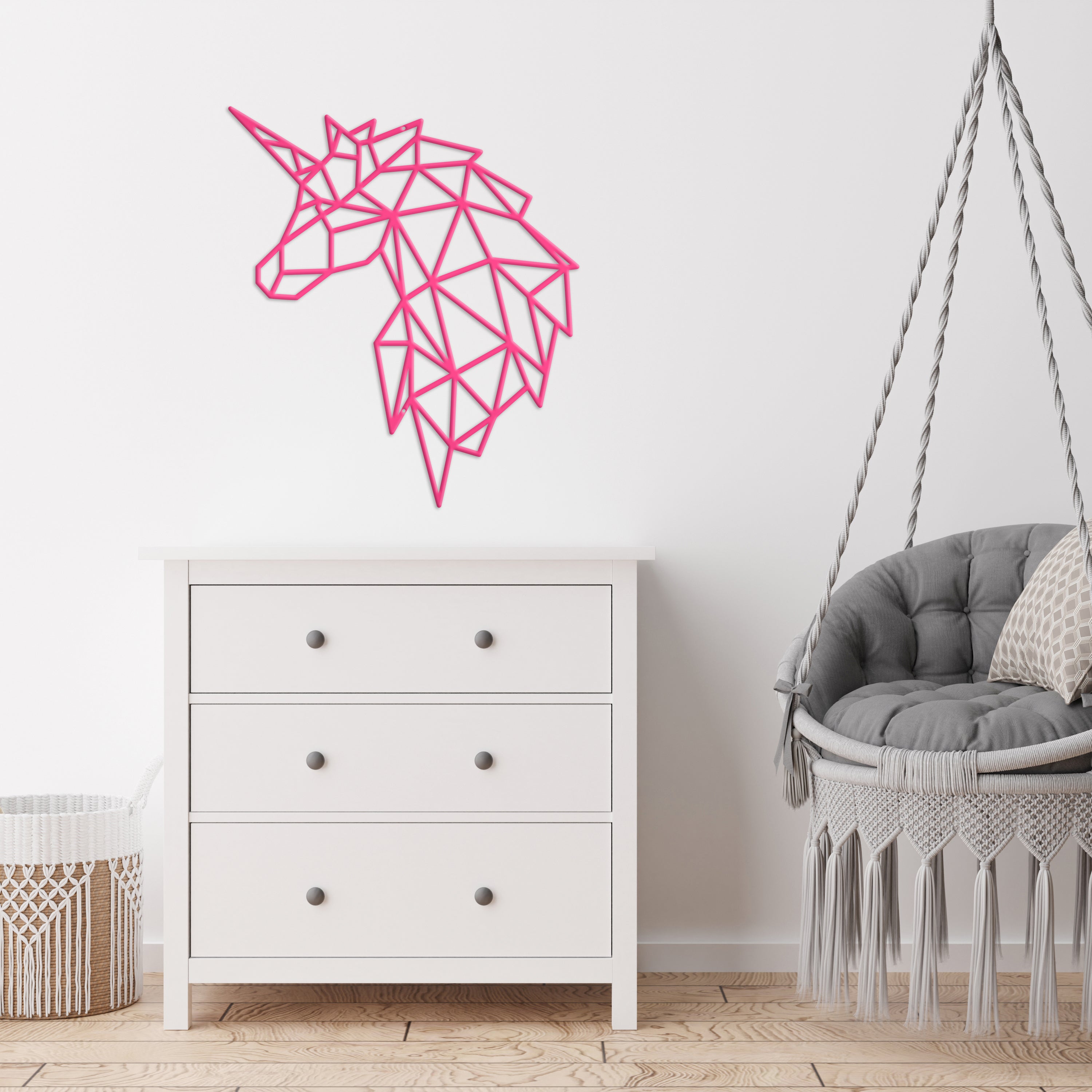 Create a magical bedroom for your child with our Geometric Unicorn Wall Decor. Beautiful and unique, this unicorn-shaped decor will inspire creativity and imagination. Made of steel, it adds a touch of whimsy to any room. Perfect for unicorn lovers of all ages.