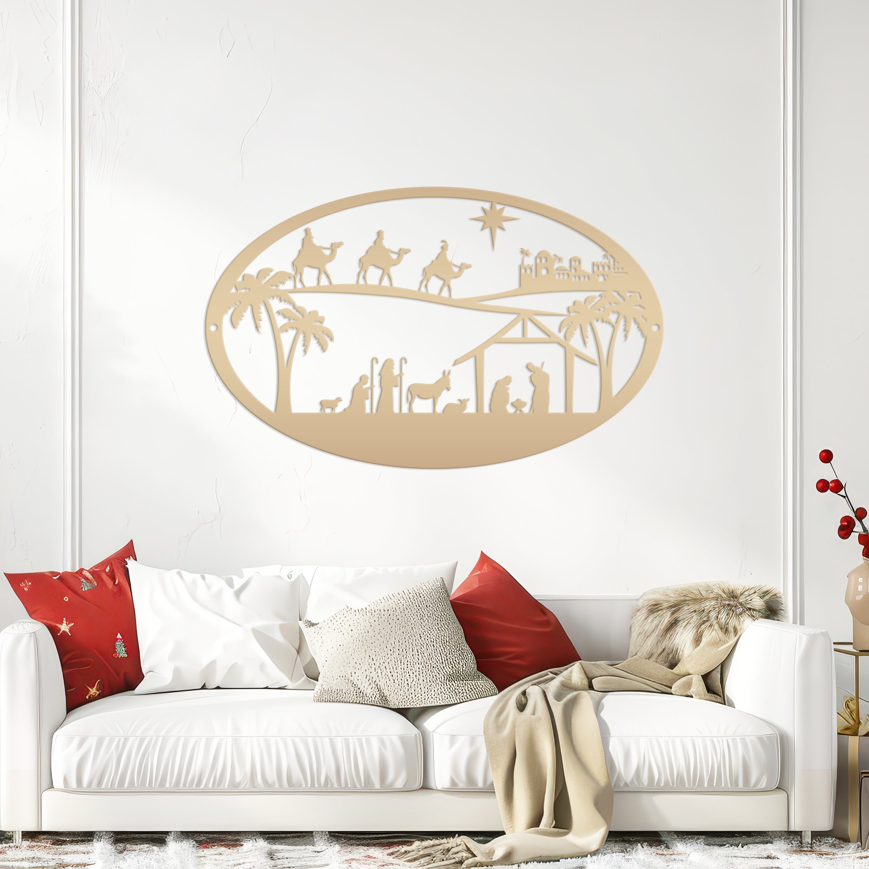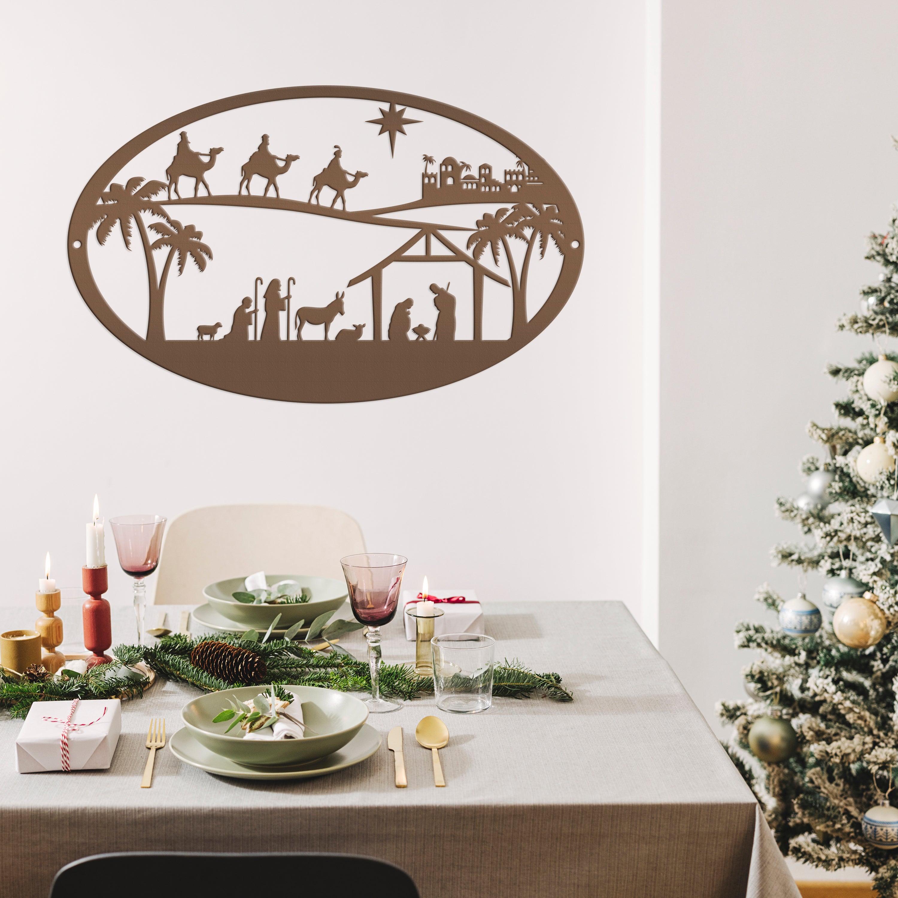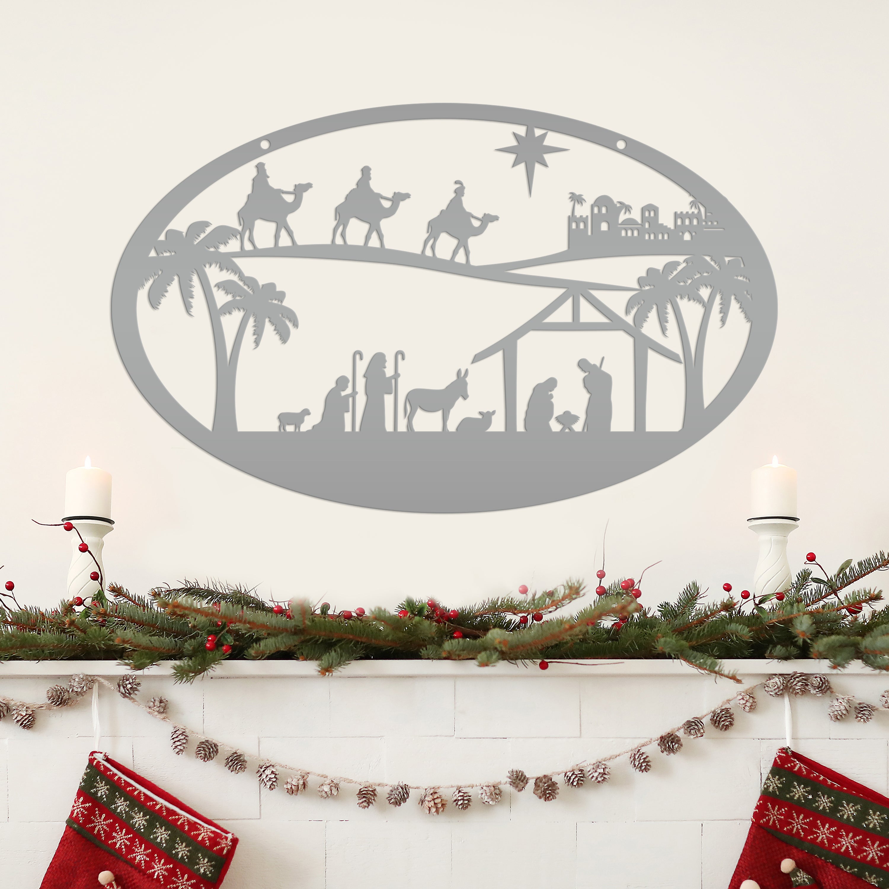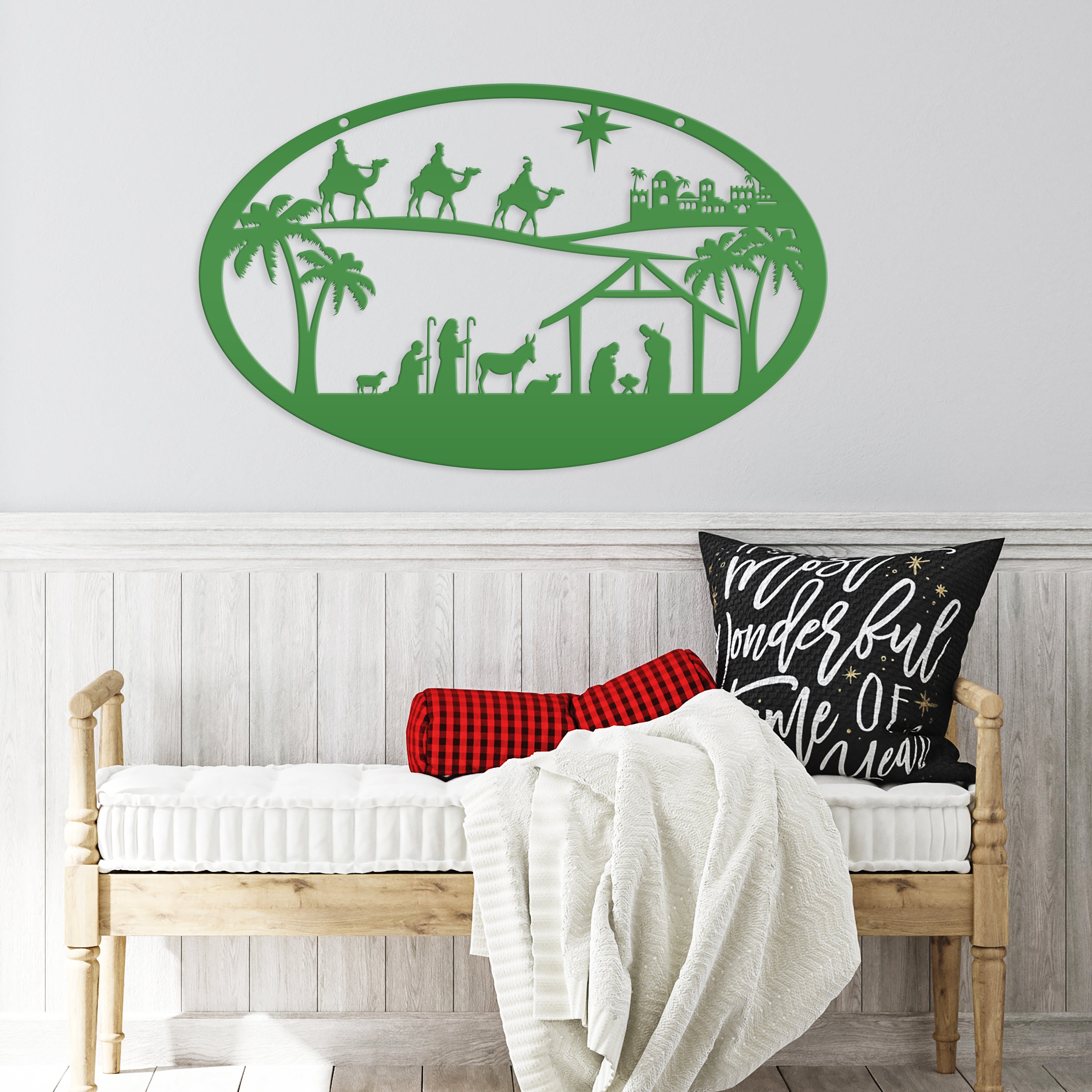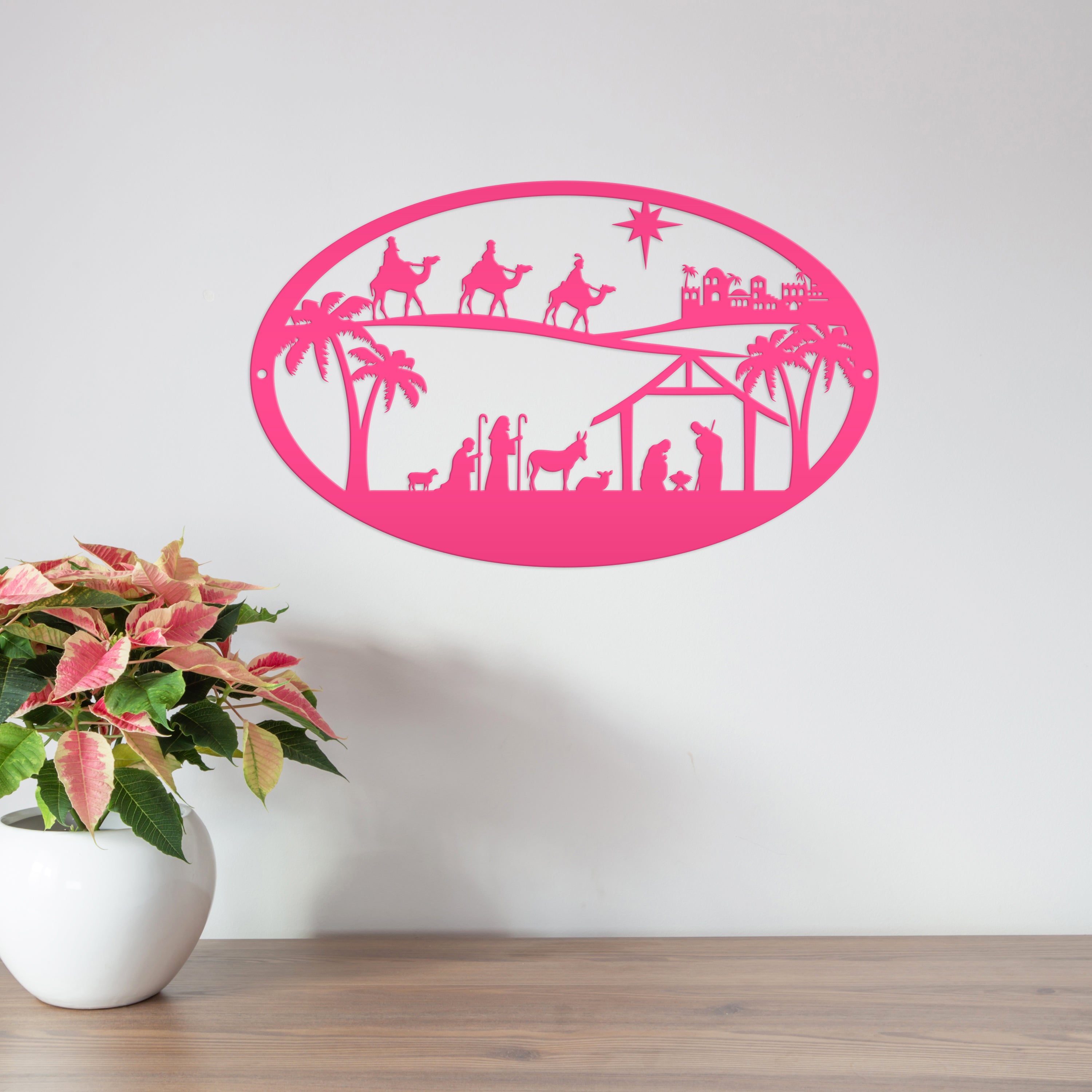 Our Metal Outdoor Christmas Nativity Scene Sign is the perfect Holiday decor for your home. It's a timeless symbol of the Christmas season that'll look great in any living room, front yard, or church! Make sure to get your hands on this beautiful Christian Christmas decor before it's gone! Hang on your front door, or on a sign hanger in your yard.